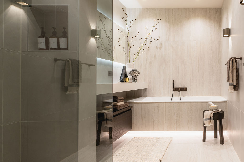 In het bruisende Amsterdam genieten Ginger en Michel van een serene en elegante badkamer, die ondanks het smalle karakter een ruimtelijk gevoel opwekt. De verfijnde Japandi stijl vormt een harmonieus geheel door het gebruik van uniforme travertin tegels die de wanden, de vloer, en zelfs de badwand bekleden.