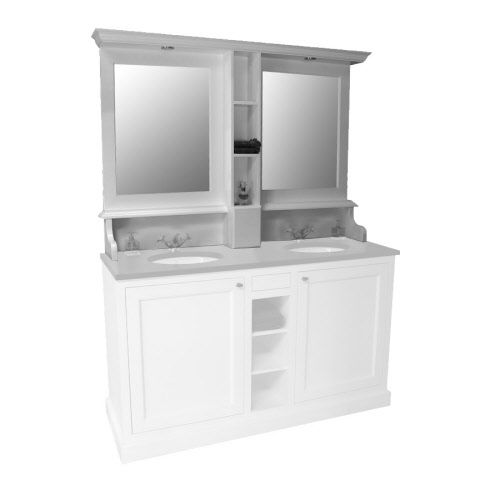 Deze klassiek landelijk nostalgisch opbouwspiegel is van massief hout en heeft 1 lade, 3 open vakken en LED verlichting