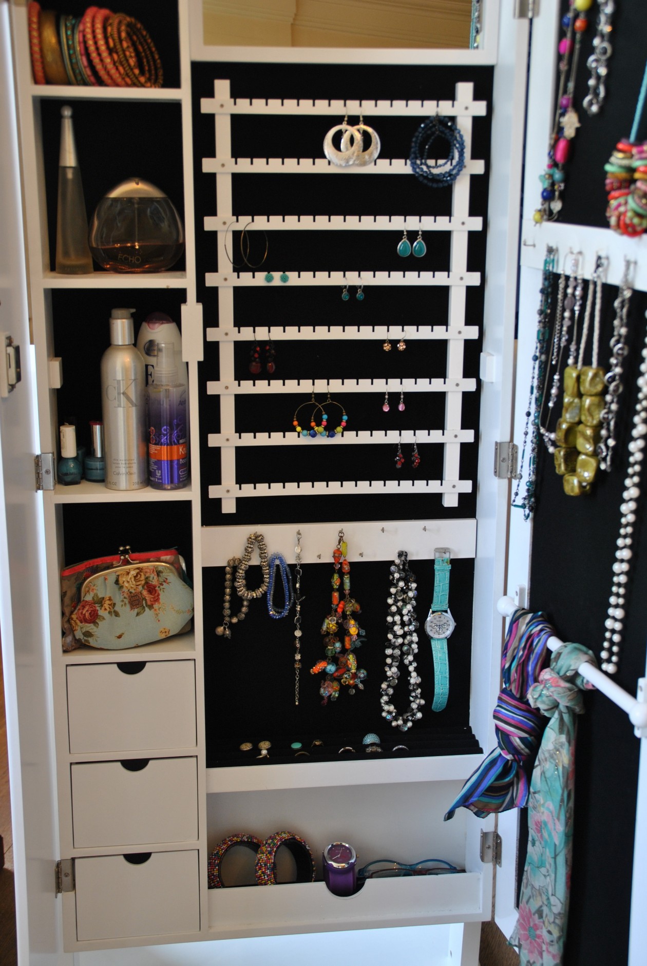 De indeling van de sieradenkast is als volgt (van boven naar beneden);
