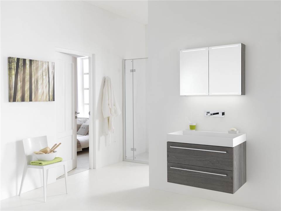 Door het slimme ontwerp van de spiegeldeuren is de LED verlichting ook door de gesloten deuren heen te zien. De spiegelkast is in 6 breedtematen verkrijgbaar. Standaard is de spiegelkast uitgevoerd met een schakelaar/stopcontact, glazen legplank en dubbelzijdige spiegeldeuren.