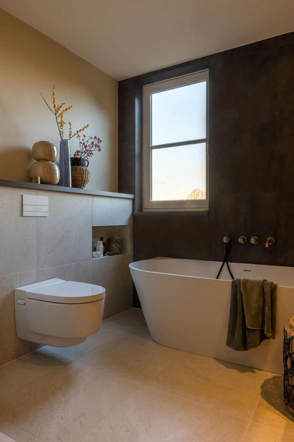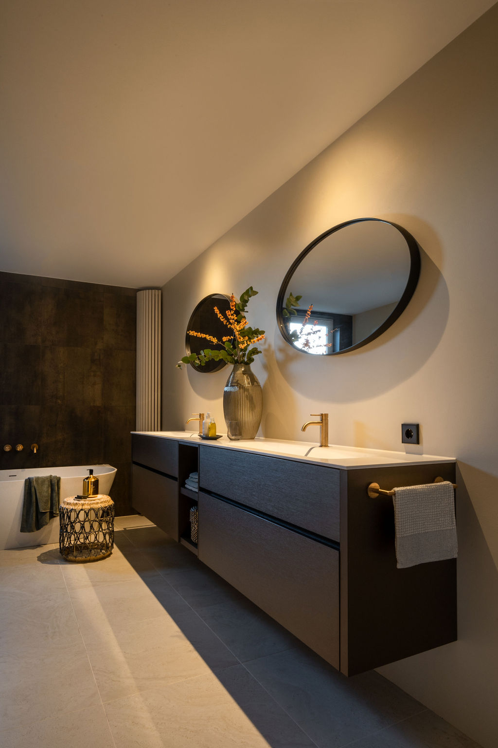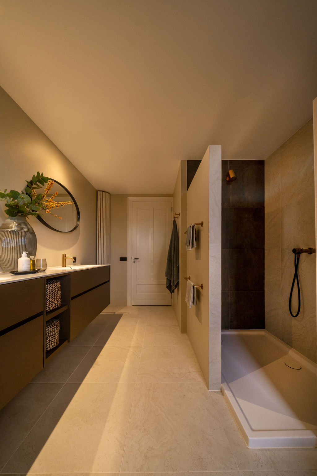 Het absolute pronkstuk van deze badkamer? Een adembenemend badkamermeubel van maar liefst 284 cm lang. Met brede, witte wastafels en unieke ovale spiegels, omlijst door een stoer zwart industrieel frame, straalt dit meubel een ongekende klasse uit die je badkamer transformeert tot een ware oase van schoonheid. Naast dit indrukwekkende meubel wachten je een verleidelijk ligbad en een luxe douche. De douche is een ware eyecatcher met zijn lage wanden, die je een gevoel van vrijheid geven terwijl je geniet van een krachtige douche. De warme, uitnodigende sfeer wordt versterkt door de prachtige keramische tegels in tinten bruin en lichtbeige.