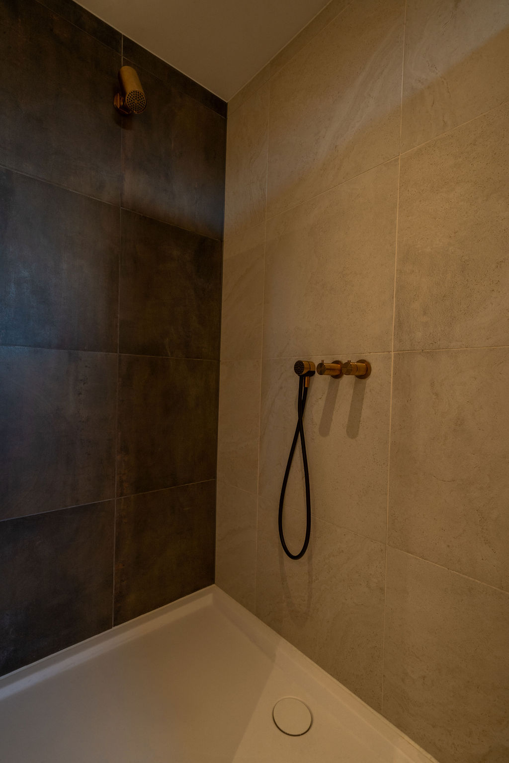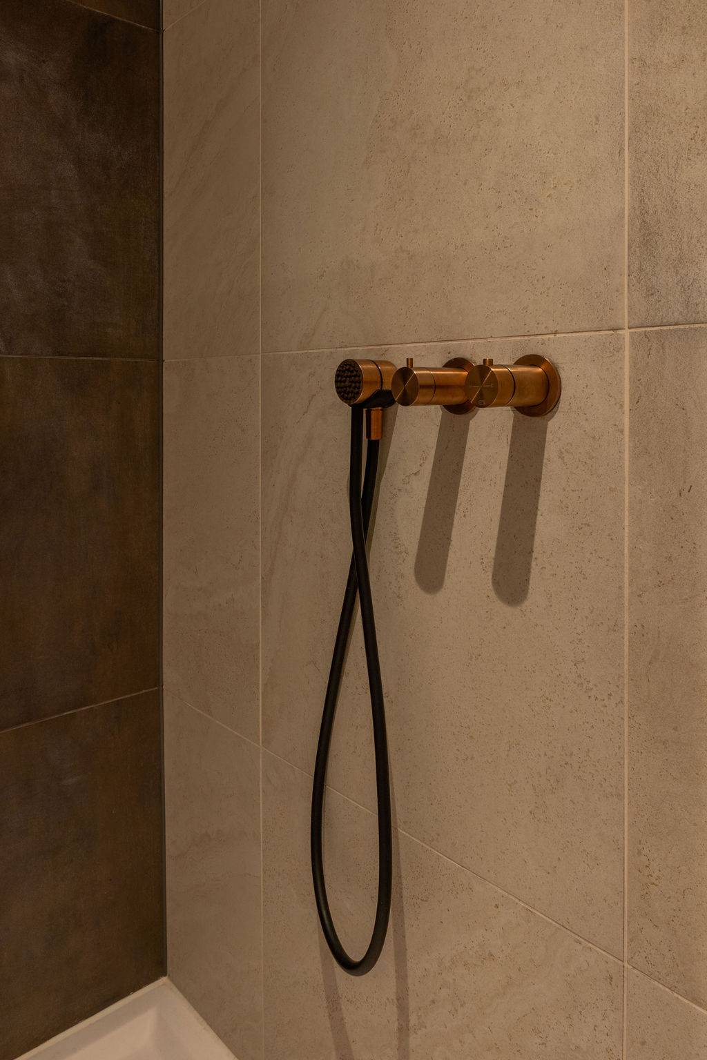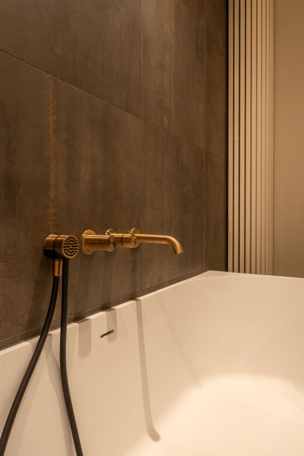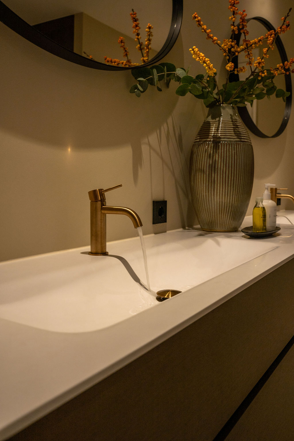 En vergeet de details niet! De kranen, van het merk Gessi, voegen een vleugje luxe toe met hun warme geborstelde bronskleur. Deze kwaliteits kranen tillen het ontwerp naar een hoger niveau van verfijning en zorgen voor een badkamerervaring die al je verwachtingen overtreft.