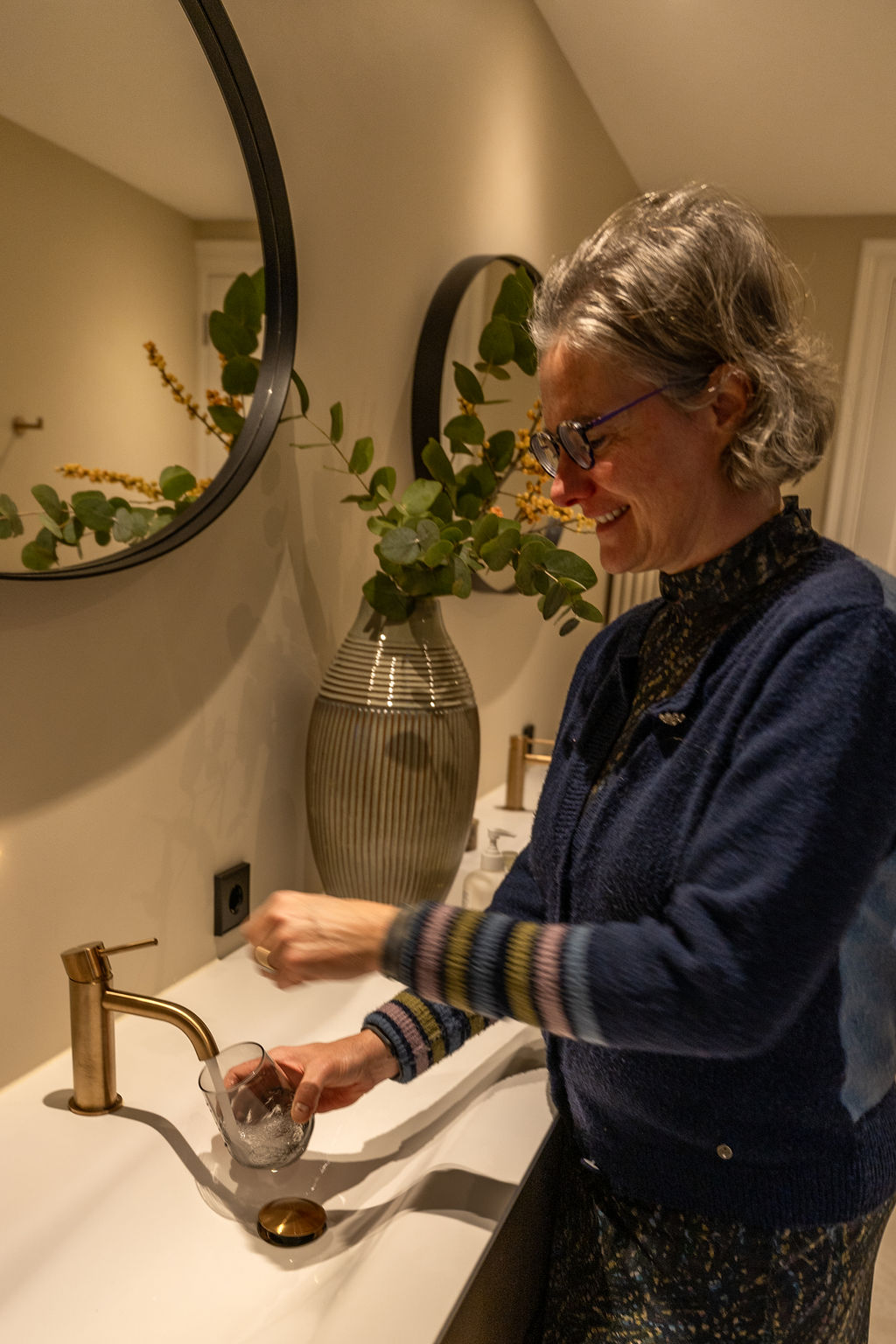 “Opmerkelijk is dat de badkamer meer minimalistisch is dan 18 jaar geleden. Toen die tijd had je allemaal blokjes met patronen en had je een stijl met veel licht en donker zo in die vloer. Nu hebben we eigenlijk vrij grote tegels, een enorme dubbele wastafel met mooie lades, dus heel veel ruimte met alles lekker opgeborgen. Dit zorgt bij elkaar voor rust in de ruimte. Eigenlijk alles bij elkaar met mooie kleurstelling. Een nieuwe inloopdouche en weer ook een nieuw bad, we zijn er erg blij mee.”