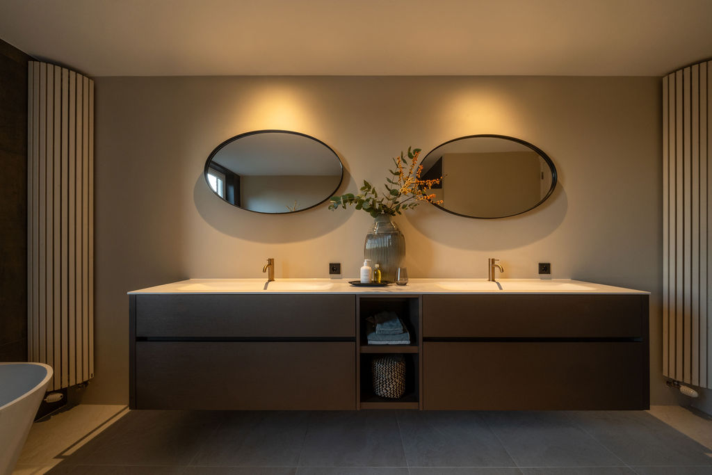 Ervaar pure luxe in deze betoverende badkamer met een adembenemend 284 cm lang badkamermeubel, unieke ovale spiegels, en luxe details van Gessi.