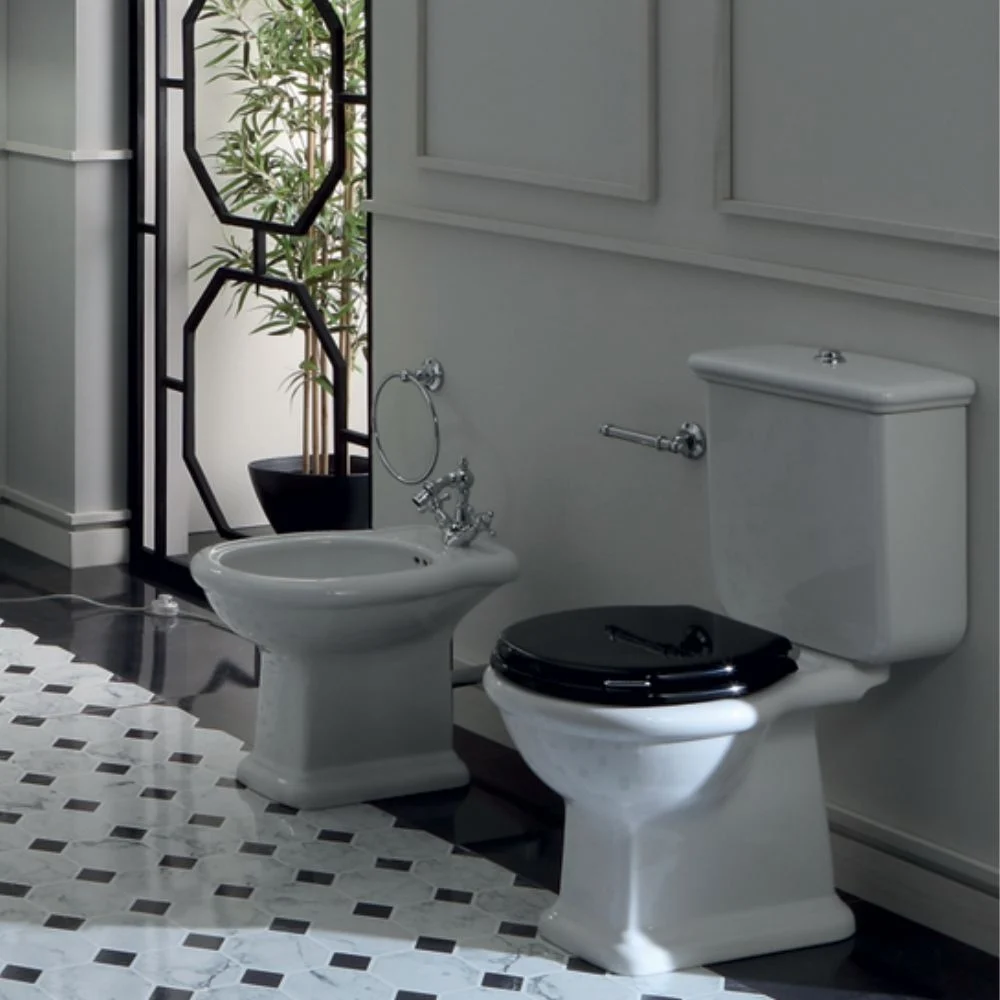 Dit landelijke duoblok toilet wordt geleverd met reservoir met binnenwerk en drukknop.