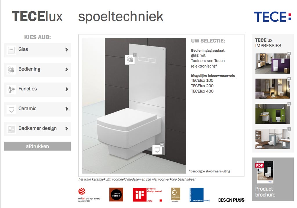 Om u op eenvoudige wijze inzicht te geven in de unieke mogelijkheden van de spoeltechniek TECElux heeft TECE een online configurator ontwikkeld. Hiermee kunt u in een handomdraai de TECElux naar wens samenstellen en zien hoe TECElux in combinatie met het gekozen toilet en de wand- en vloeraankleding eruit ziet. U kunt kiezen uit verschillende soorten materialen voor de wand en de vloer, wat de gepleisterde wand betreft kunt u zelfs alle kleuren instellen!