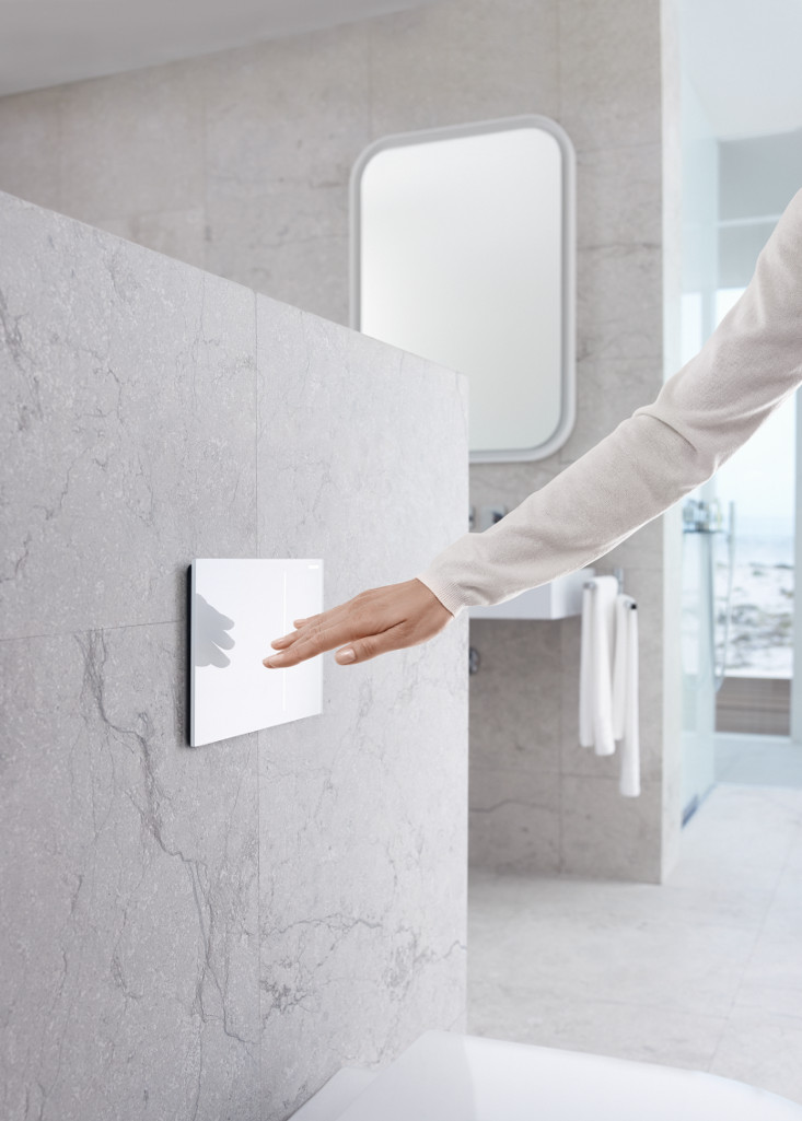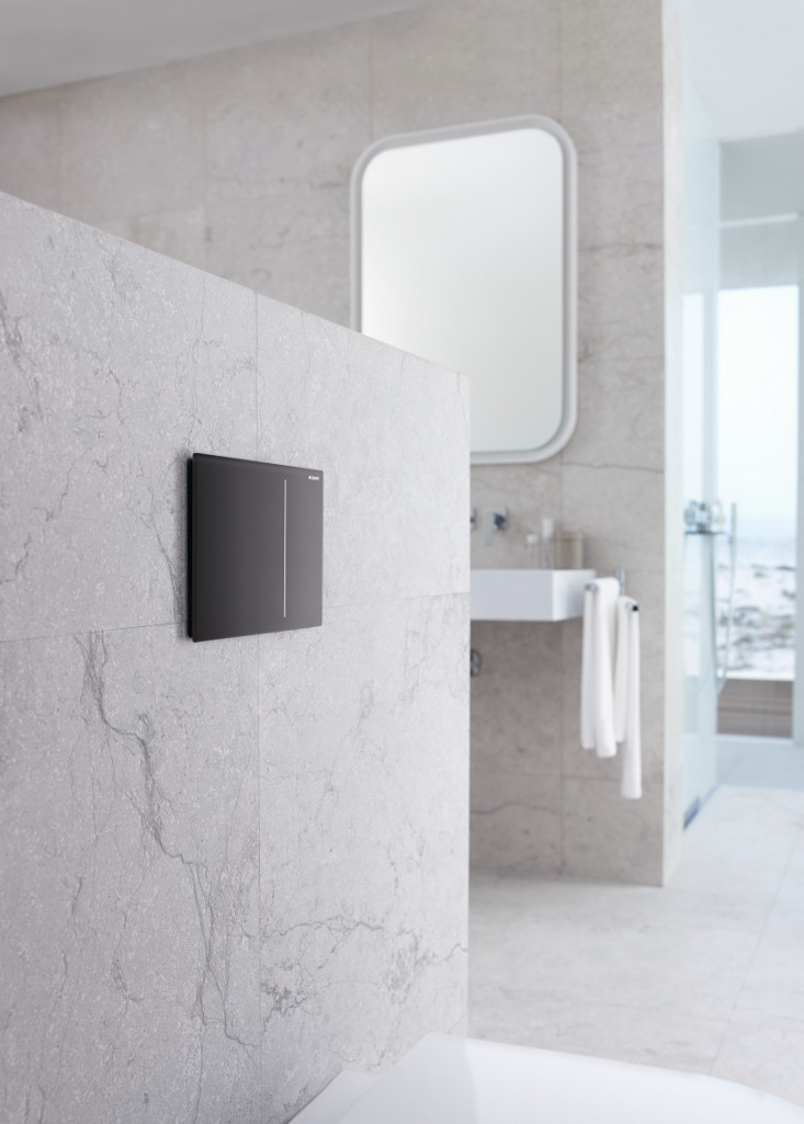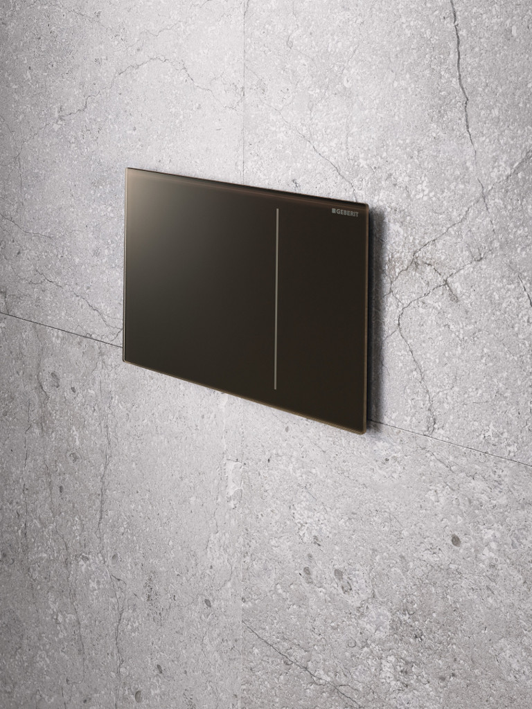 Het 'doortrekken' van het toilet is verleden tijd met de nieuwe Sigma70 van Geberit. Een slanke plaat van glas of roestvast staal, zwevend op een paar millimeter vanaf de wand, zonder toetsen of knoppen; zo ziet de Sigma70 bedieningsplaat eruit. Uniek aan deze bedieningsplaat is dat het traditionele 'doorspoelen' niet meer van toepassing is. Met een lichte druk op de glazen of rvs plaat wordt het spoelmechanisme in werking gesteld. Dit is mogelijk dankzij een servo-eenheid, die slim gebruikmaakt van de waterdruk in de toevoerleiding. Door deze techniek is er geen elektriciteit nodig en hoeft er alleen maar lichtjes op de linker of rechterzijde – afhankelijk of men een grote of kleine spoeling wenst - van de bedieningsplaat gedrukt te worden. Een plaat met verfijnde elegantie voor stijlbewuste personen.