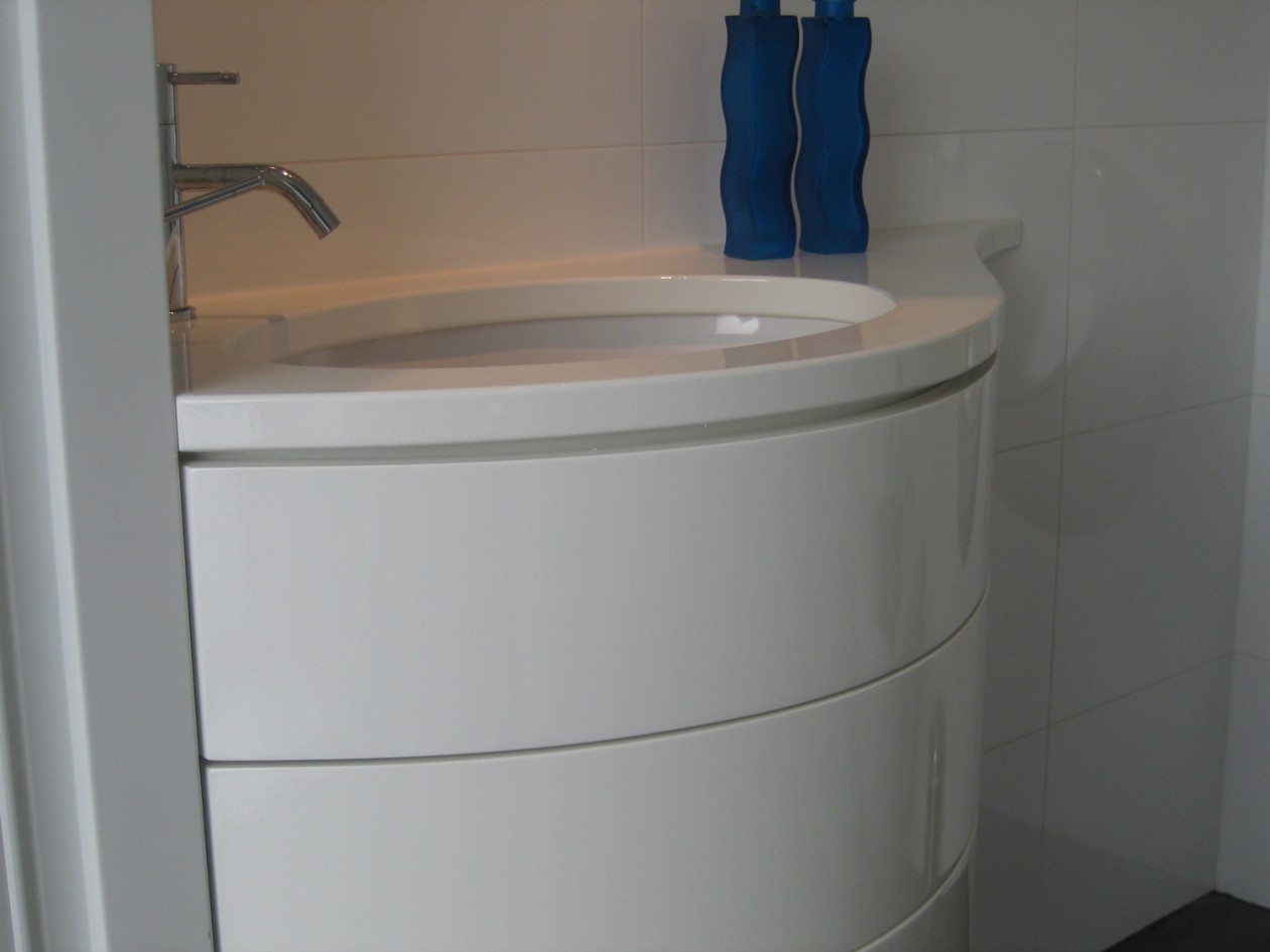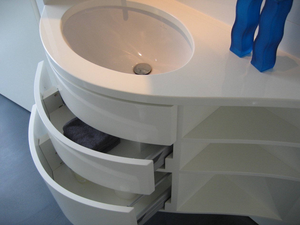 Blad ook van hoogglans wit gespoten mdf met een witte, ovale keramische onderbouwwaskom (Villeroy & Boch). In het linker deel drie lades, greeploos (push-systeem), die geheel met de organische vorm meelopen.