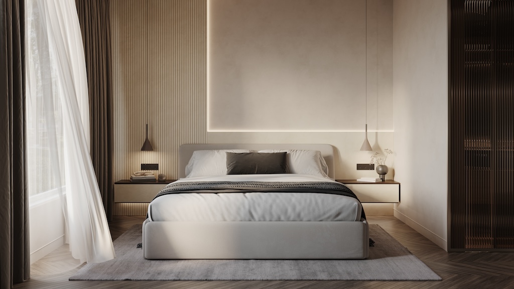 Deze collectie nodigt uit tot bijzondere inrichtingen en out of the box oplossingen voor wanden en aankleding van ruimtes. Normaal zou je ‘steen’ niet zo snel gebruiken voor de inrichting van de slaapkamer maar in deze setting waar een accent wordt gezet op de achterwand met Ukiyo in de natureltint Nacre geeft het de ruimte een kalme uitstraling.