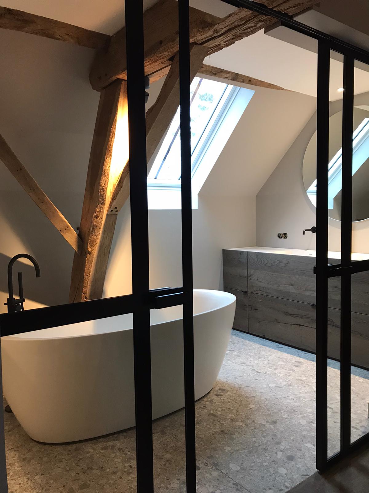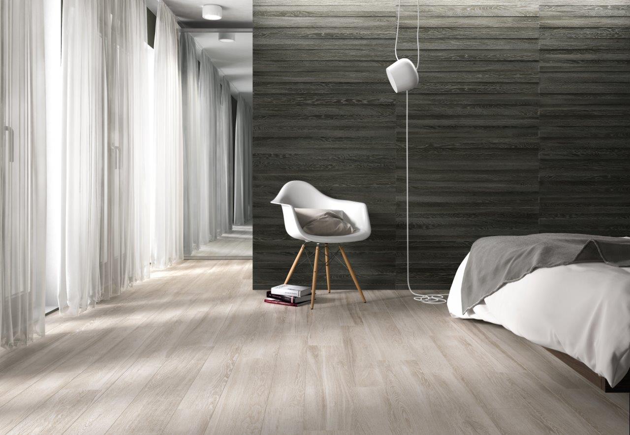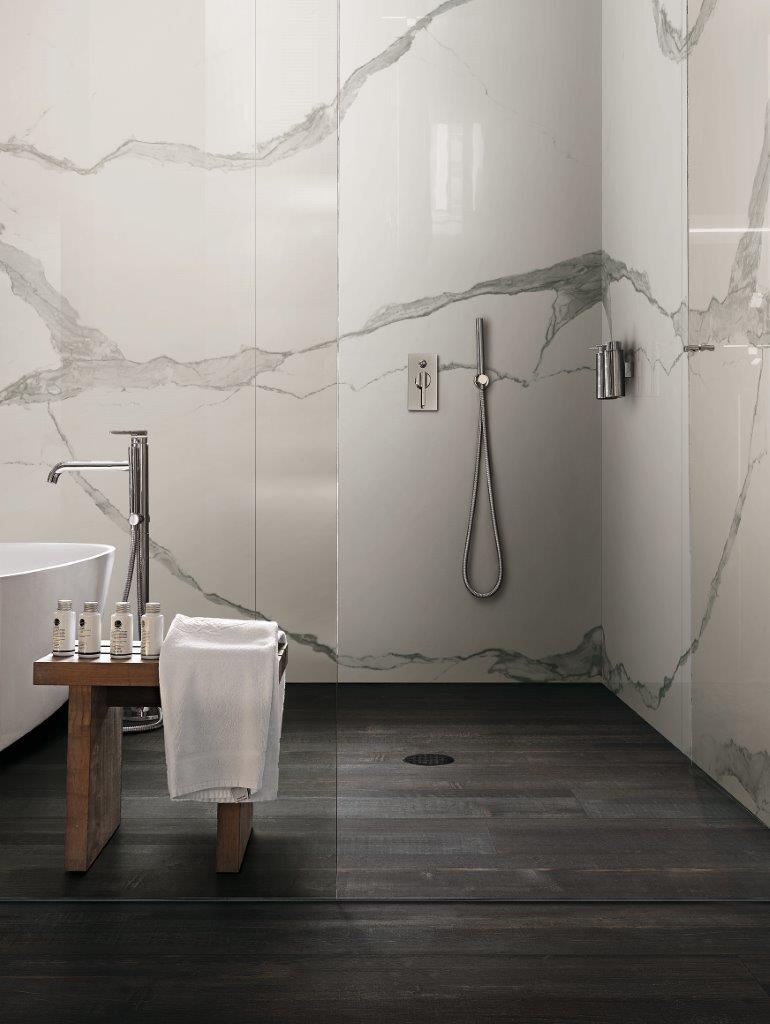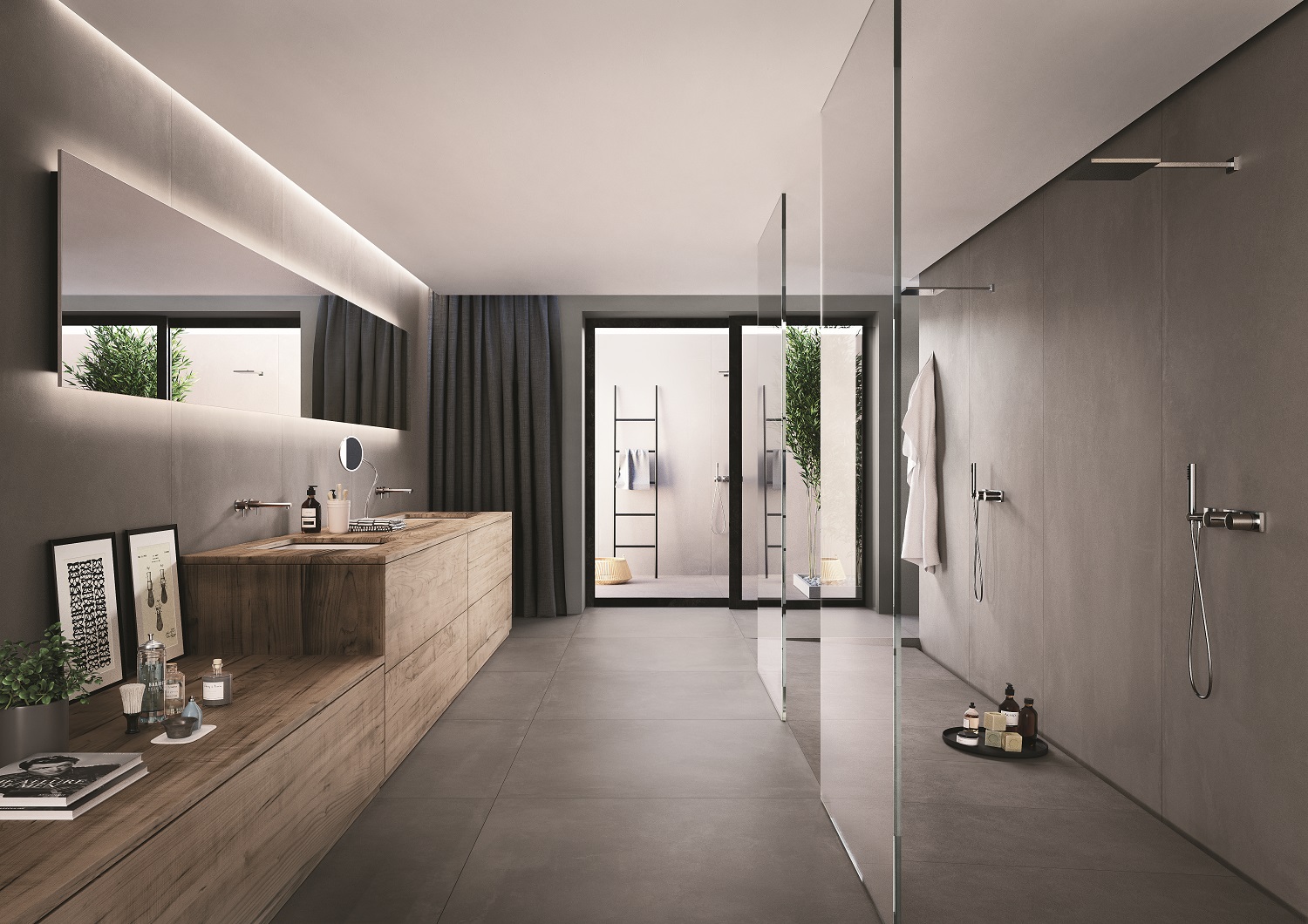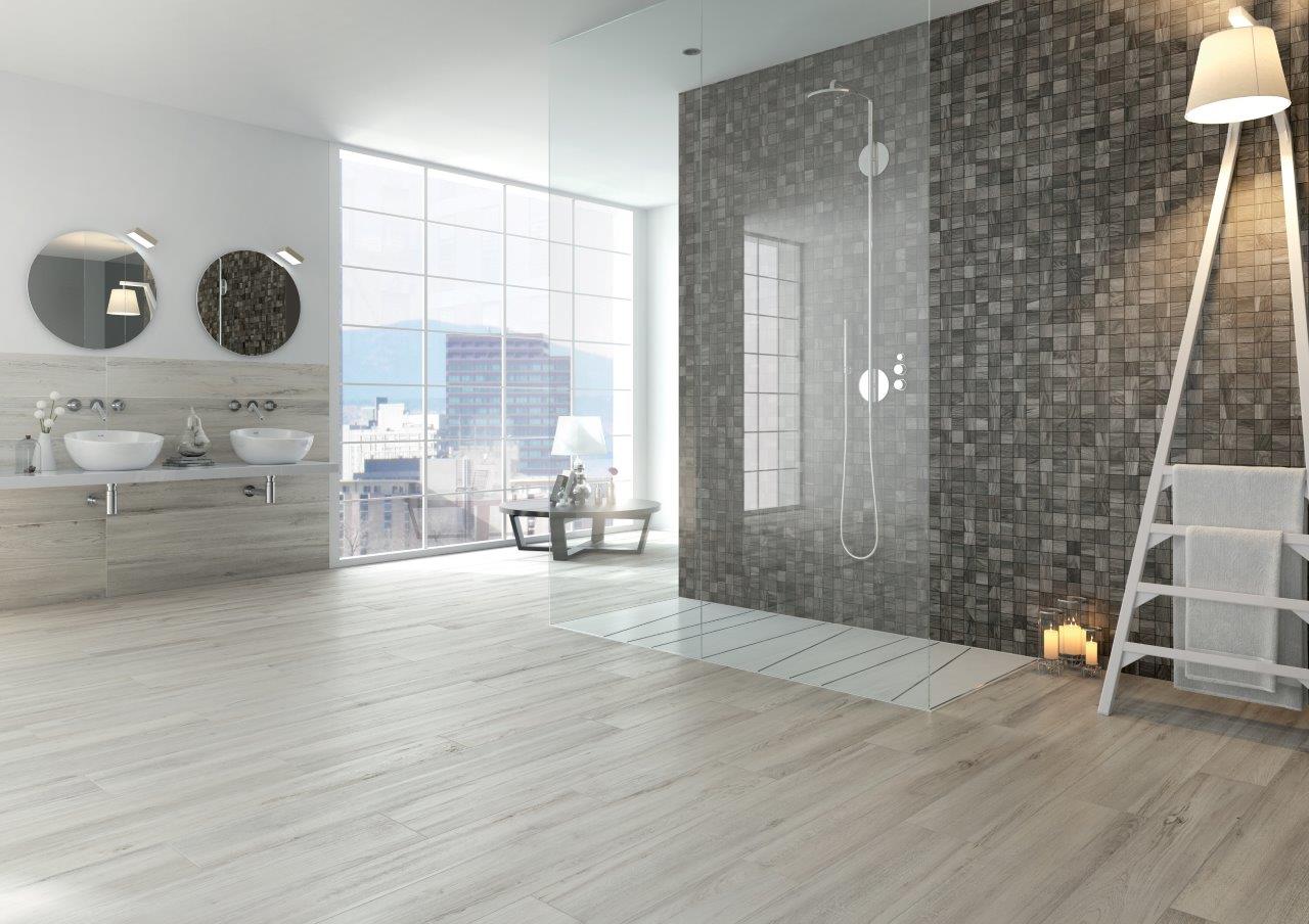 Tegenwoordig zijn keramische tegels in ontzettend grote afmetingen te krijgen. Het staat heel mooi om die grote platen tegen de wand te plaatsen. Op die manier krijg je geen of hooguit alleen verticale naden, wat heel rustig oogt. Voor de vloer kun je kiezen voor keramische badkamertegels in een kleiner formaat of juist in een contrasterende kleur.