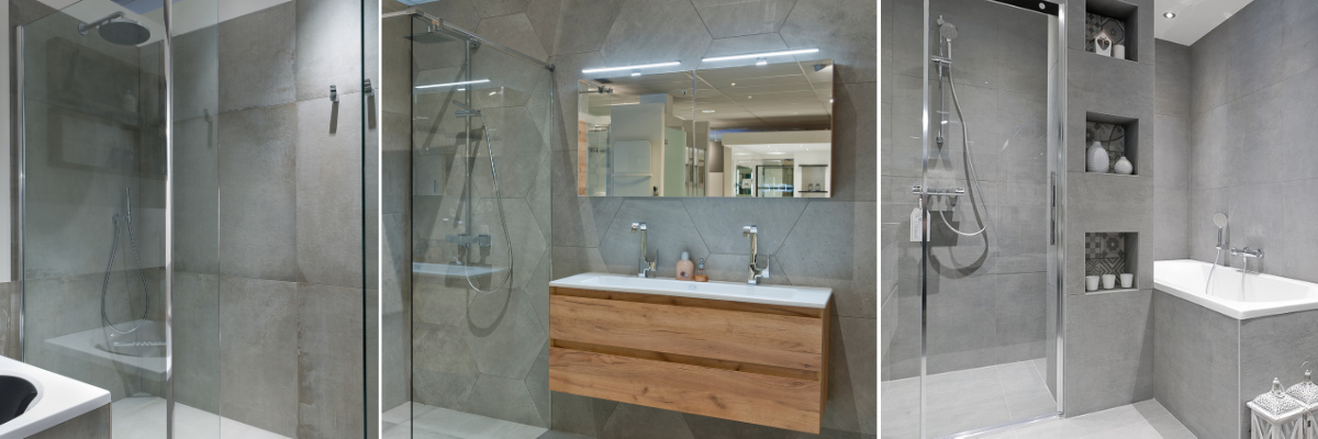 Een hele subtiele badkamertegel trend zijn grote tegels in een natuurlijke look. Denk aan de kleuren grijs of ecru. Om te zorgen dat de wanden niet te saai worden kun je kiezen een wand te bekleden met natuurlijke badkamertegels met een andere textuur. Hieronder zie je enkele voorbeelden. Door de badkamer in één kleur te betegelen met grote tegels lijkt de ruimte automatisch groter. Ideaal voor in kleinere ruimtes dus.