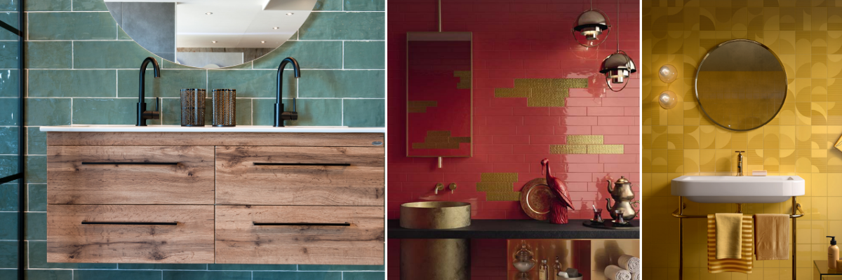 Wat we op dit moment veel terug zien komen zijn badkamertegels in opvallende kleuren. Veel klanten kiezen ervoor een badkamer met witte of grijze tegels en bekleden een wand met opvallende badkamertegels in bijvoorbeeld groen of blauw. Meestal is dit de muur waar ook het badkamermeubel aan grenst. De felle kleur zorgt voor een speelse twist en een moderne look.