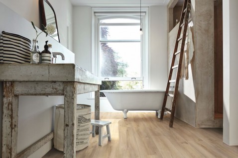 Een hoogwaardige PVC-vloer van Moduleo in hout of natuursteenlook biedt hier oplossing. De slijtvaste toplaag, van 0,55 mm dik en de speciale coating Protectonite®, beschermt de vloer tegen vocht en vlekken en maakt hem ideaal voor in de badkamer. Moduleo® vloeren uit de Impress en Transform kenmerken zich door een prachtig uitstraling van hout en steen met alle voordelen van PVC.