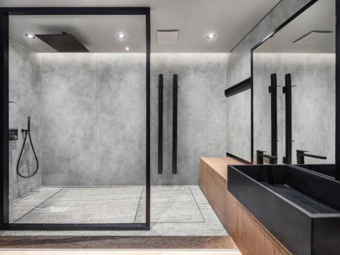 tot individuele bedrukking verkrijgbaar. Nog meer exclusiviteit in de badkamer bereiken de nieuwe Silktouch-oppervlakken, die een anti-fingerprint-effect hebben en een hoogwaardige matte uitstraling met een zijdeachtige glans bieden. De fluweelachtige look is verkrijgbaar in een look van fijn steen, marmer en sierbeton. Ook hier kunnen originele motiefwensen met behulp van individuele prints worden gerealiseerd.