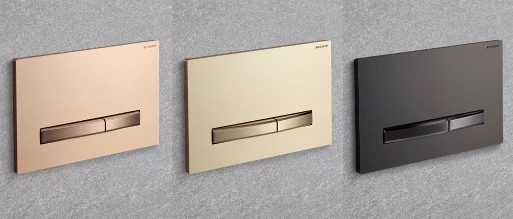 Nieuwegein, september 2023 – In veel toiletruimtes siert de Sigma50 bedieningsplaat de wand boven het closet. Deze populaire 2-toets plaat is al jaren een vast en geliefd onderdeel van de Geberit badkamercollectie, mede door het verfijnde ontwerp en de vele kleur- en materiaalcombinaties. Geberit heeft hier nu drie nieuwe metaalkleuren in een toon-in-toon samenstelling aan toegevoegd, namelijk roodgoud, zwartchroom en messing. Deze nieuwe bedieningsplaten zijn vanaf heden verkrijgbaar