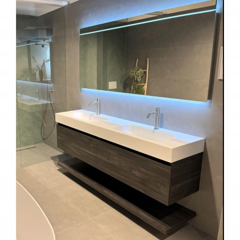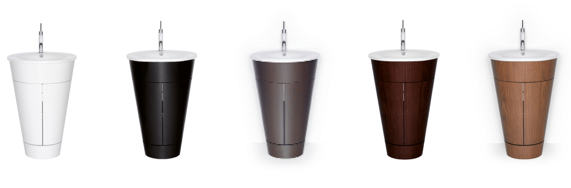 Meervoudig gebogen, gelijmd gelamineerd hout vormt de basis van het naar beneden conisch toelopende meubel, waarop de cirkelvormige keramieken wasbak ligt. De buitenzijde van het meubel is ofwel met echthoutfineer bekleed, dat door een laag melaminehars wordt beschermd, ofwel met een lakbaar laminaat, dat later met hoogglanslak afgewerkt kan worden. Nadat de deuren uitgesneden zijn, wordt aan de achterzijde een muuraansluiting aangebracht; hier worden later de watertoevoer en -afvoer doorheen geleid. De bouwdelen van elke individuele ton zijn doorlopend genummerd, zodat ze duidelijk bij elkaar passen en het fineer mooi doorloopt. Elk exemplaar is dus uniek, waar heel veel handwerk in zit.