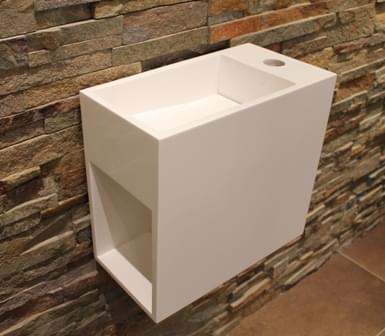 De Luva 1335 is de hoge variant. Deze heeft aan de linker zijkant een handig open schap waar badkamerspullen in opgeborgen kunnen worden. De afvoer is volledig weggewerkt in de fontein. Dit geeft een stijlvolle, strakke uitstraling.