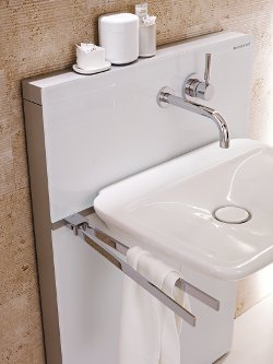 Het Geberit Monolith wastafel element - naar ontwerp van Daniel Irányi - biedt de oplossing die voorziet in deze behoefte en tegelijkertijd ook verschillende technische uitdagingen op elegante wijze overwint. Aan het element kan een wandkraan en een wastafel bevestigd worden. De ruimte in het element wordt efficiënt gebruikt doordat de aan- en afvoerleidingen, de wastafelsifon en opberglades zich allemaal in het element bevinden. Zonder hak- en breekwerk kan de badkamer middels deze unit gerenoveerd worden. Naast deze functionele toepassingen heeft het Monolith wastafel element van Geberit een strak en modern design door de glazen voorplaat en het aluminium zijframe. Zo kan de badkamer in een handomdraai gemoderniseerd worden tot een design badkamer.