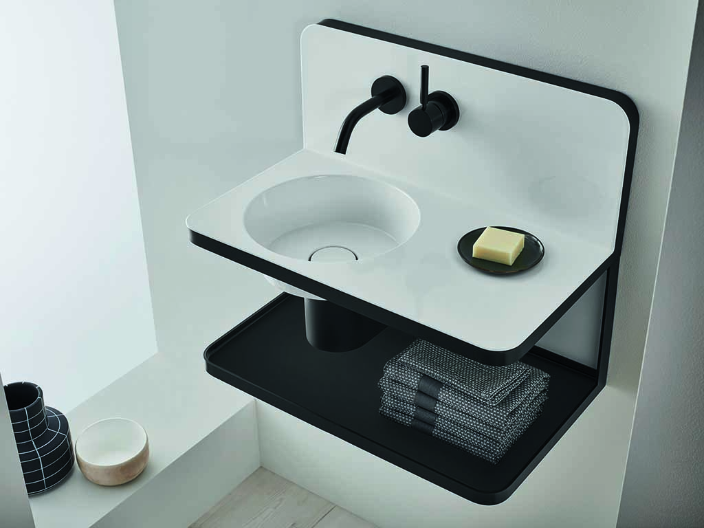Het nieuwe product verrast door vele details: exacte oppervlakken, kleine radii en nauwkeurig op elkaar afgestemde verhoudingen van de verschillende elementen. Functie en ontwerp vormen een harmonieus geheel. 'Steel19' bestaat uit een complete eenheid, inclusief wandkraan, en is snel en eenvoudig te installeren: het inbouwdeel is voorgemonteerd en verborgen achter de achterwand en de sifonbekleding. Op locatie hoeft alleen nog de wandbevestiging en de aansluiting van de hoekventielen gedaan te worden. Het wastafelblad en de achterwand zijn van geglazuurd staal. In het wastafelblad is naadloos een waskom geïntegreerd met vlakke ventielklep. Het frame en de sifonbekleding hebben een matzwarte poedercoating. Het filigranen zwarte frame biedt een sterk contrast met de witte geëmailleerde kom en achterwand. Samen onderstrepen ze het industriële karakter van het wastafelmeubel.