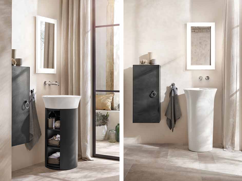 De variant als vrijstaand wastafelmeubel is eveneens een highlight. De exact passende meubelonderbouw is verkrijgbaar in vijf zijdemat en vijf hoogglans lakken. Bijzonder zijn de van de beide zijden toegankelijke glazen legplanken die extra opbergruimte bieden. De legplanken kunnen ook in houtvarianten (eiken natuur en Amerikaans noten) worden uitgevoerd.