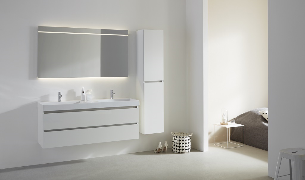 Thebalux Beat 2.0 wastafel Fresco keramiek 140 x 45 cm, greeploze kasten in hoogglans wit mat antraciet lak en spiegel Thin line 140.