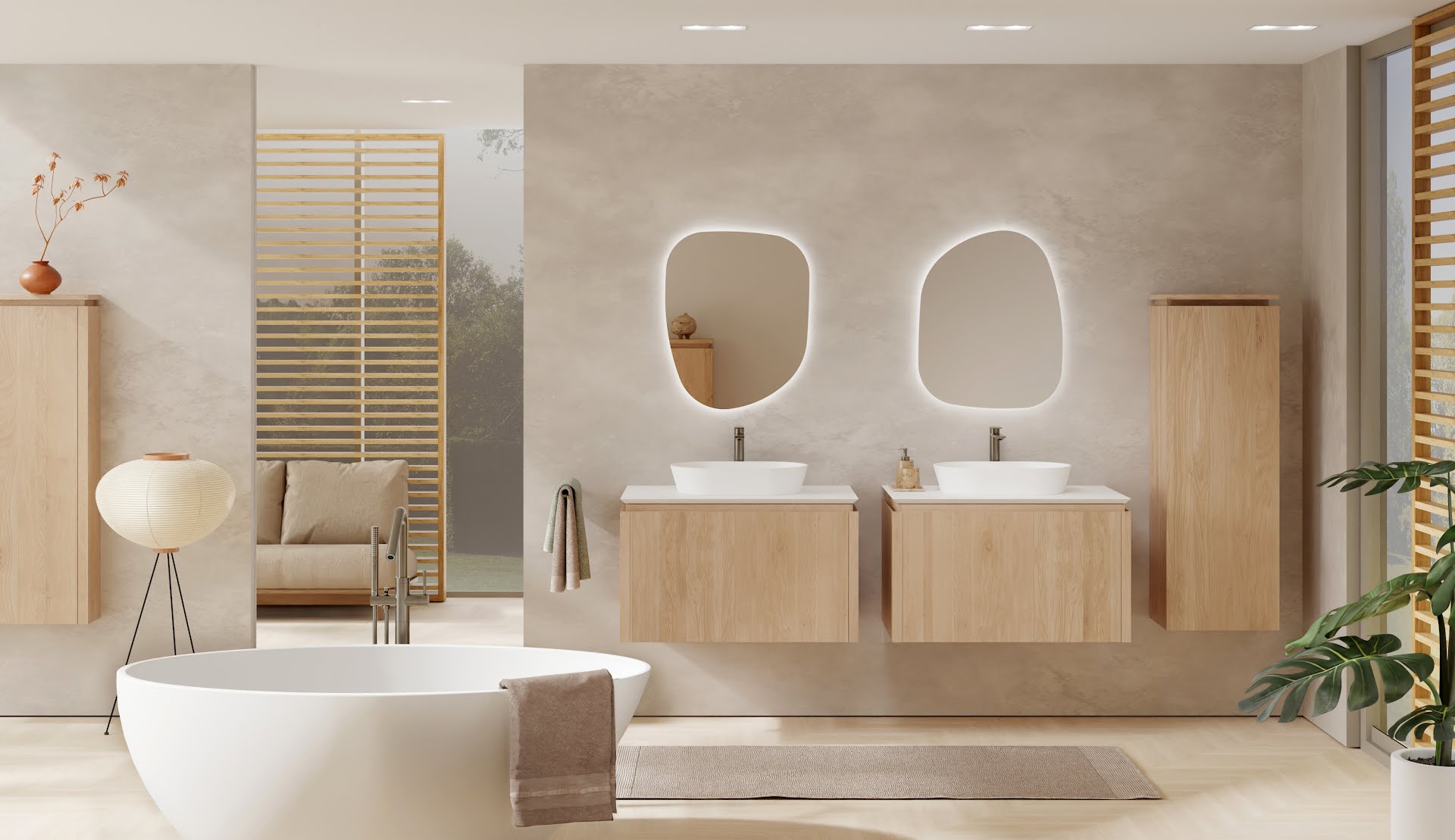 Organische lijnen en afgeronde vormen zijn een krachtige stijltrend. Ovale spiegels, vloeiende meubels en rondere baden zorgen voor warmte en elegantie. Deze zachte vormen geven niet alleen een visueel aantrekkelijke look, maar zorgen er ook voor dat kleinere badkamers optisch groter lijken, waardoor de ruimte luchtiger en luxueuzer aanvoelt.