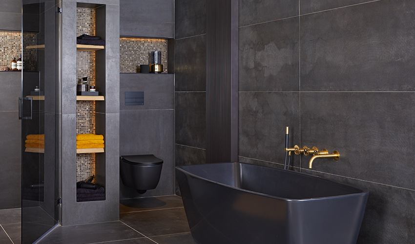 Zwart vormt de basis van de badkamer. Er is gekozen voor zowel matzwart als zwart met een zacht, licht vervaagd karakter. Deze kleuren glimmen niet, versterken het ruimtelijk effect en geven het podium aan gouden accenten en glimmende badkameraccessoires.