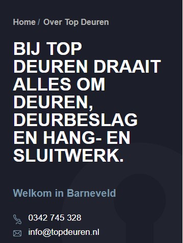 Eiken deuren, kamerhoge deuren, houten deuren in staallook; de keuze in deuren bij Top Deuren is overweldigend. In de grote showroom ontvangt u van de deurspecialisten het beste advies bij de aanschaf van uw deuren en passend deurbeslag. Vanuit het pand in Barneveld levert Top Deuren al sinds 1993 deuren aan particulieren en aannemers. Ondertussen mogen we ons wel de grootste deurspeciaalzaak van midden-Nederland noemen. Gerwin van den Brink is sinds begin 2022 mede-eigenaar van Top Deuren en zal zich het vak meester maken: “Dit bedrijf is al meer dan 25 jaar gespecialiseerd in binnen- en buitendeuren, beslag en hang- en sluitwerk. Met de mooiste en beste merken kunnen wij voor iedere klant de perfecte deuren leveren”.