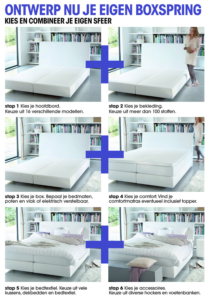 DroomDomein heeft een exclusief boxspringconcept “Ontwerp nu je eigen boxspring”, waarbij je jouw bed van matras tot nachtkastje zelf kan samenstellen. Dat gebeurt in zes logische stappen. Je kiest eerst jouw hoofdbord, vervolgens jouw bekleding en dan achtereenvolgens jouw box, het comfort (het matras), de accessoires en tot slot het bedtextiel. In elke stap krijg je een ruime keuze aangeboden van modellen, maten, comfortmogelijkheden, kleuren en stijlen.