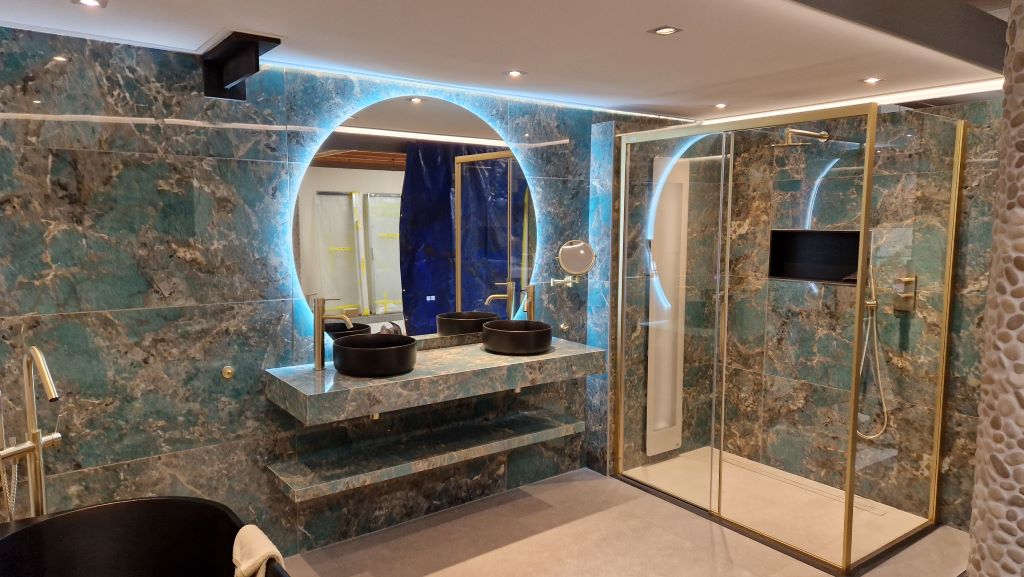 In onze moderne toonzalen met een totale oppervlakte van 2000 m² hebben wij veel badkamers, tegelopstellingen en natuurstenen vloeren. Verder hebben wij de grootste haardentoonzaal in uw regio met veel haarden en schouwen van strak tot klassiek.
