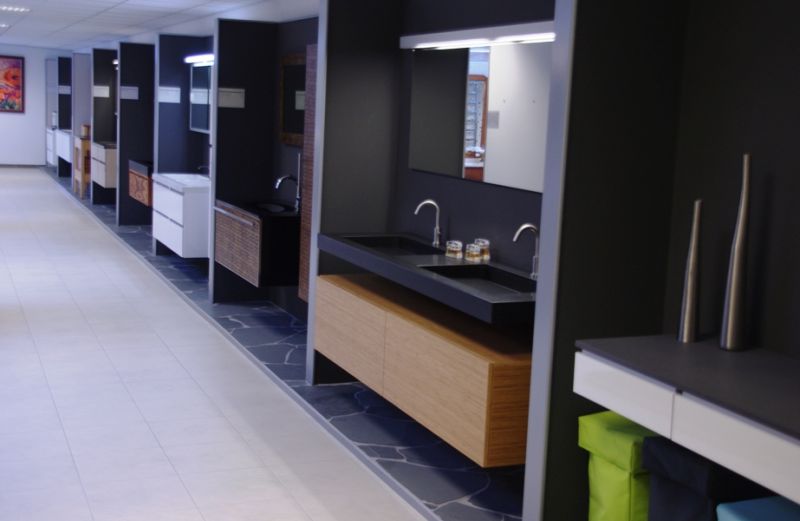 De eerste verdieping van de showroom is ingericht voor de uitgebreide sanitairopstellingen, van uiterst klassiek tot hypermodern.