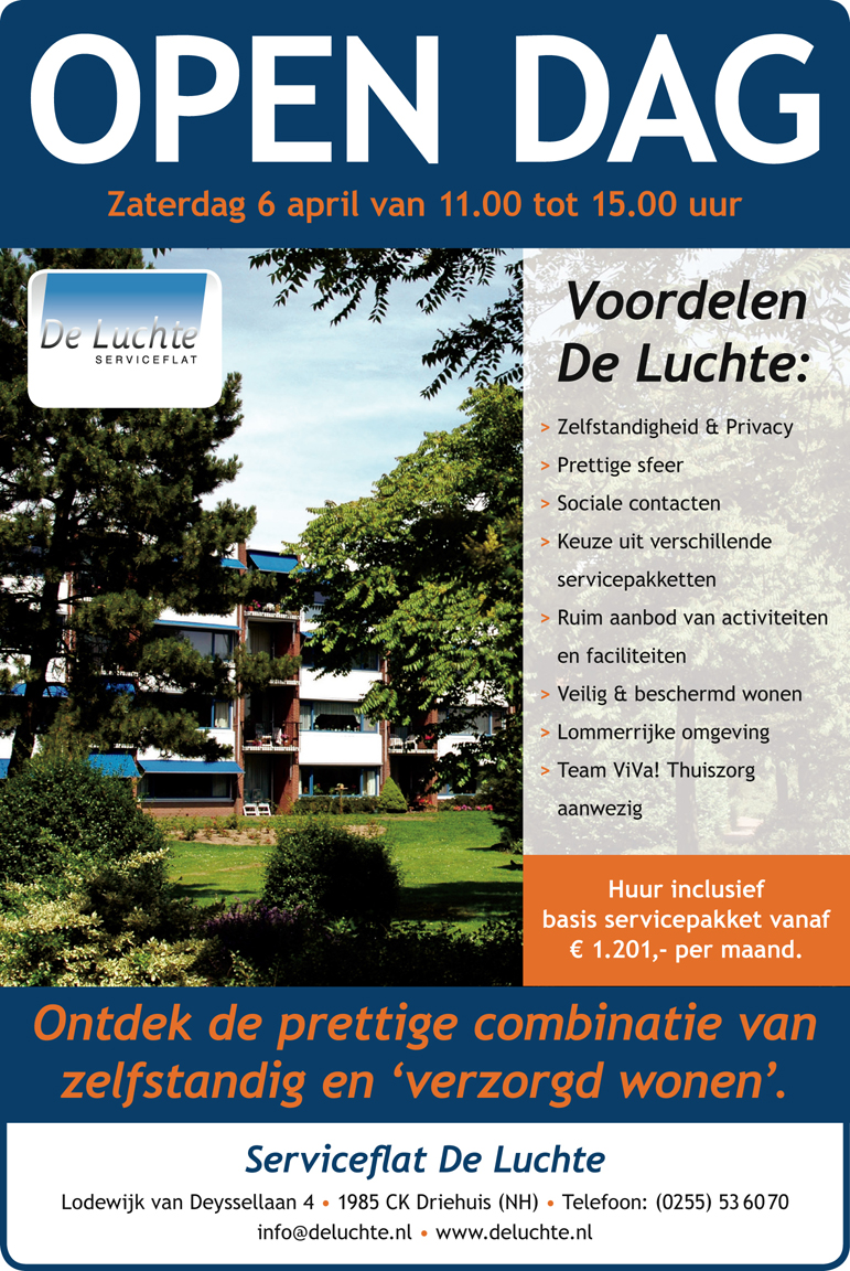 U wilt zelfstandig wonen in een omgeving die uw privacy respecteert en tegelijkertijd voor geborgenheid en gezelligheid zorgt? Serviceflat De Luchte biedt een combinatie van individueel en collectief wonen in de omgeving van Haarlem, Heemstede en Amsterdam (Noord-Holland). Juist de combinatie van beide woonvormen maakt wonen in De Luchte zo plezierig. U behoudt de regie over uw eigen leven en verrijkt het met de ongedwongen en prettige sfeer van ons ‘huis’.