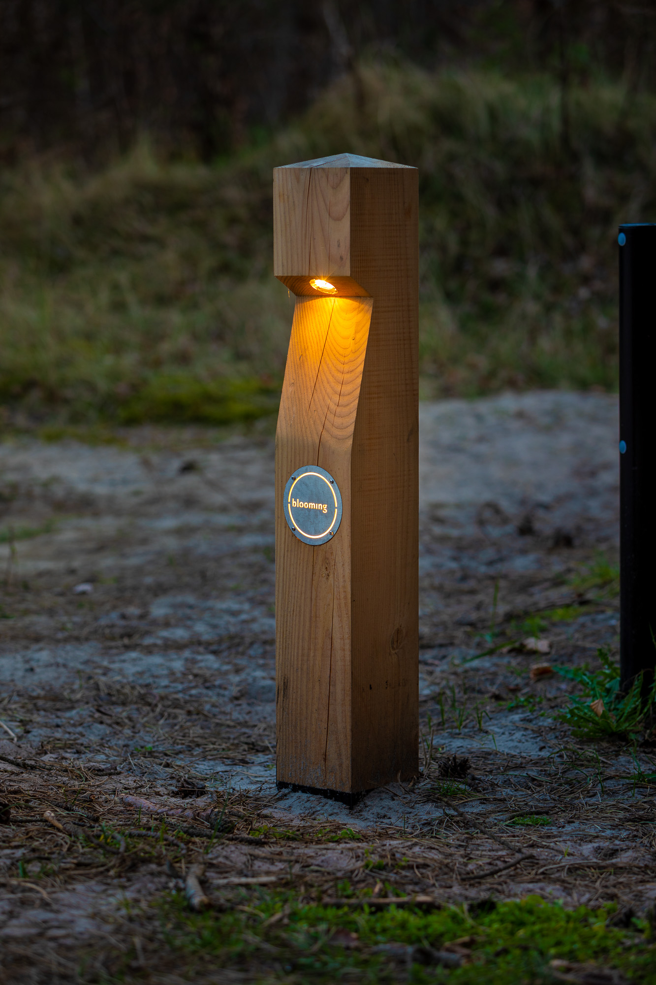 Houten buitenverlichting die niet ín de natuur staat, maar één is met de natuur.
