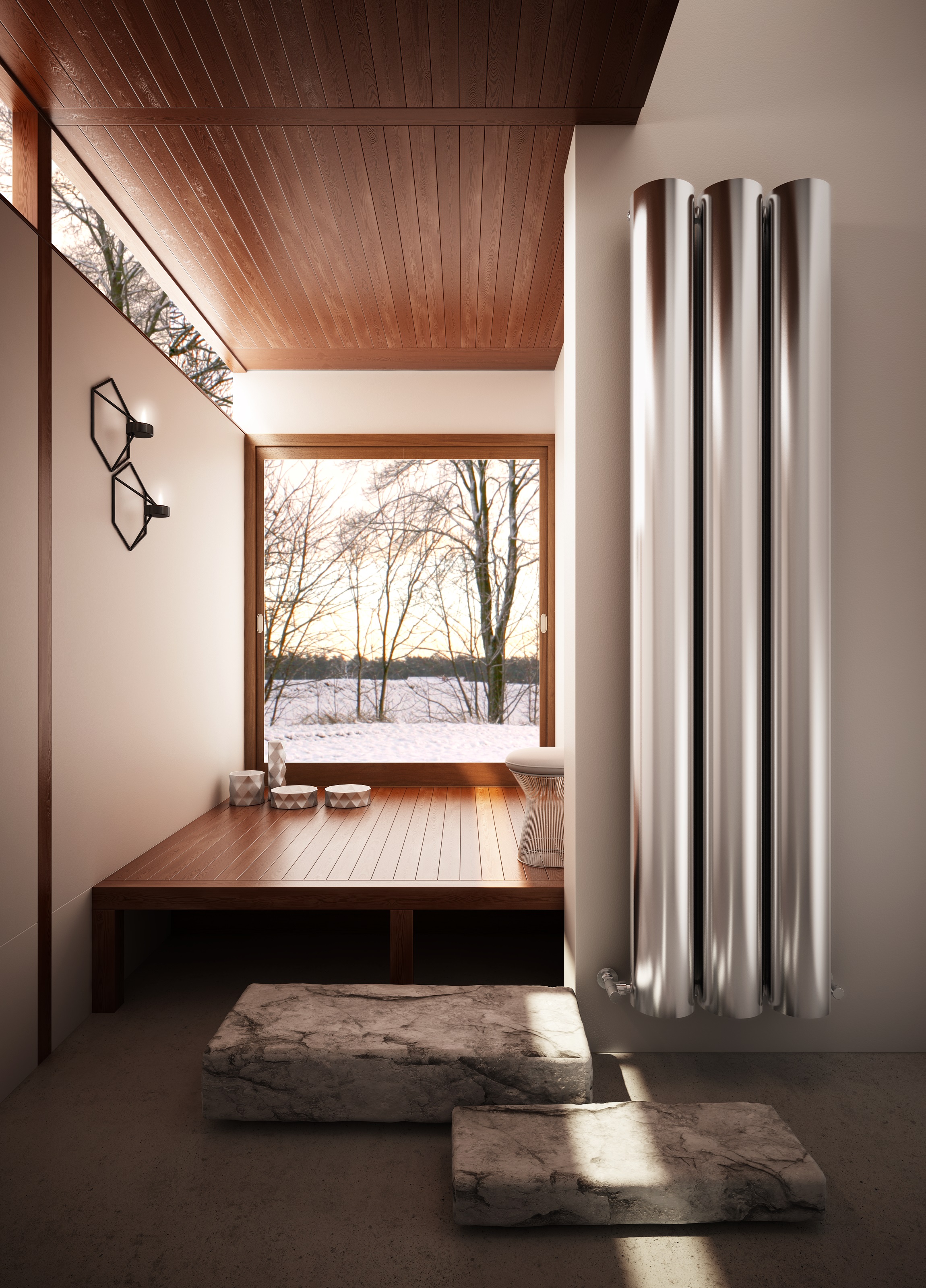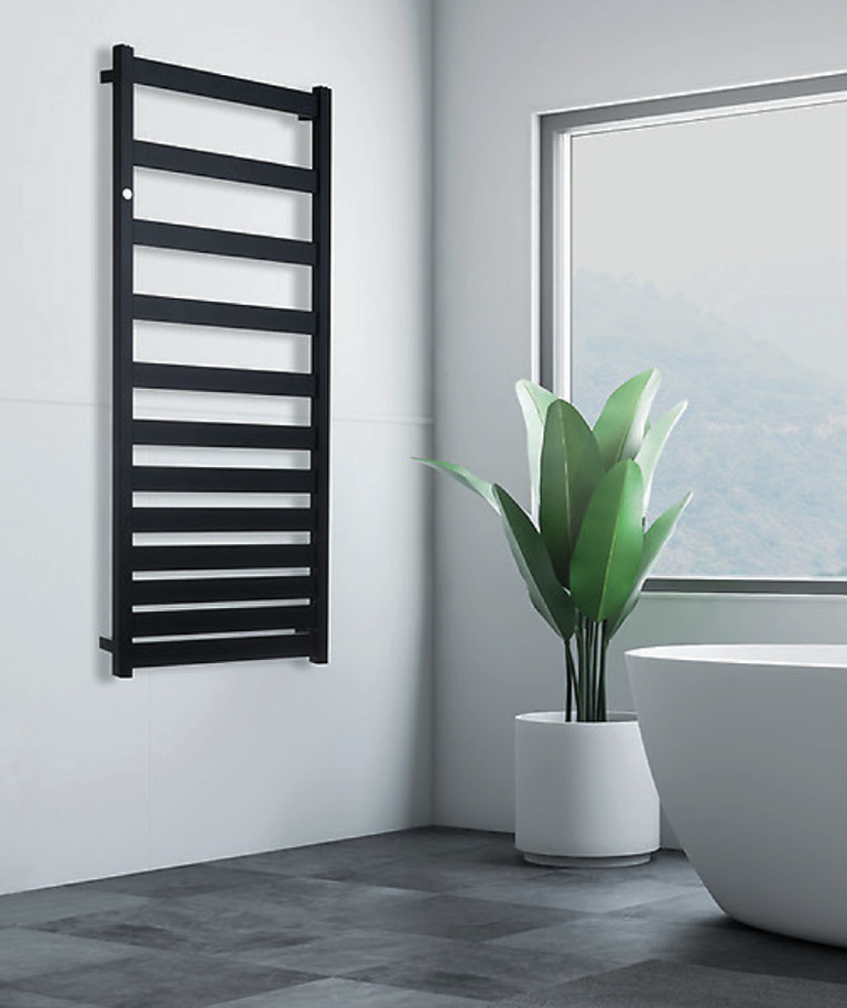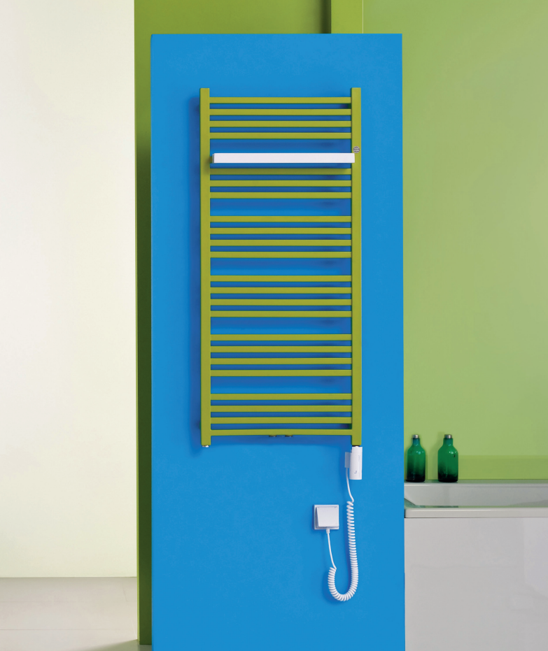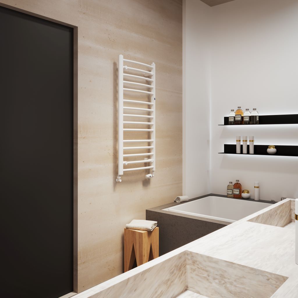 Een nieuw model in de serie handdoekradiatoren. Verrassend door de combinatie van rond en vierkant samen te laten komen.