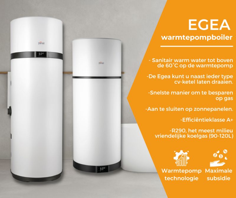 De Egea is verkrijgbaar in boilervolumes van 90, 120, 200 en 260 liter, zodat u de warmtepompboiler precies op de behoefte van het huishouden kan afstemmen. De Egea werkt op zijn warmtepompfunctie tot wel -7 graden buiten en maakt nog 62 graden sanitair warm water bij een aanzuigtemperatuur van -5 graden.