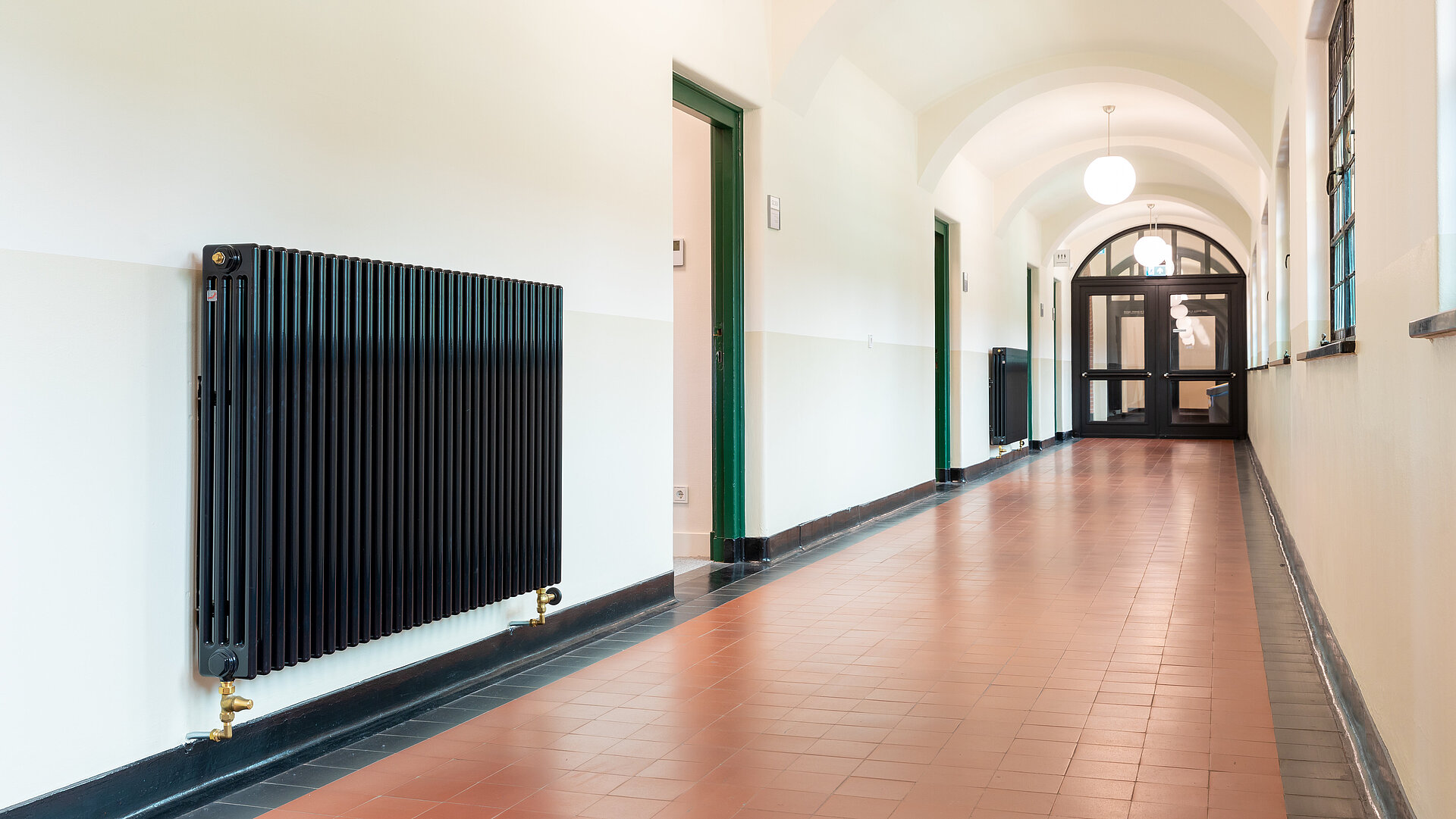 In Berchmanianum is bewust gekozen voor de Zehnder Charleston. Deze iconische kolomradiator wordt sinds 1930 geproduceerd en is sindsdien voortdurend verbeterd. De Charleston was destijds de eerste stalen radiator die zowel lichter als voordeliger was, terwijl hij meer warmte afgaf dan andere radiatoren. Zehnder heeft dit klassieke ontwerp door de jaren heen blijven perfectioneren met technische aanpassingen in het productieproces. De tijdloze, elegante vorm is echter altijd behouden en blijft tot op de dag van vandaag zeer populair.