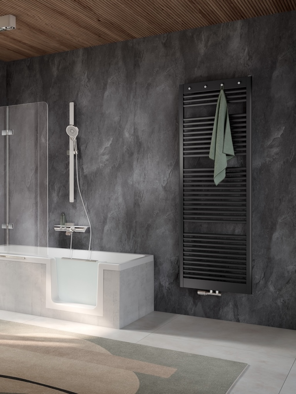 Radiatoren in moderne badkamers moeten al lang niet meer alleen voor behaaglijke kamertemperaturen zorgen - tegenwoordig is er vraag naar functionele verwarmingsoplossingen die ook kunnen worden gebruikt om handdoeken te drogen en op een comfortabele temperatuur te brengen. De Line Pro designradiator biedt voldoende ruimte voor maximaal vier handdoeken dankzij de verchroomde handdoekhaken die erboven zijn gemonteerd. Omdat de achterkant vrij blijft, kan de verwarmingswarmte nog steeds onbeperkt worden afgegeven. Met de optionele anticorrosiecoating is de designradiator optimaal beschermd tegen binnendringend vocht en spatwater en kan hij dus probleemloos in de buurt van de douche, het bad of de wastafel geïnstalleerd worden. De radiator in het tijdloos rechte design is verkrijgbaar in de afmetingen 600 x 1215 mm en 600 x 1775 mm en in de kleurvarianten wit en fijn gestructureerd grafietzwart. Voor elke smaak en badkamerindeling is hiermee een passende verwarmingsoplossing te vinden, die naast een optimale prijs-prestatieverhouding ook voldoet aan de hoogste eisen op het gebied van gebruikscomfort en functionaliteit.