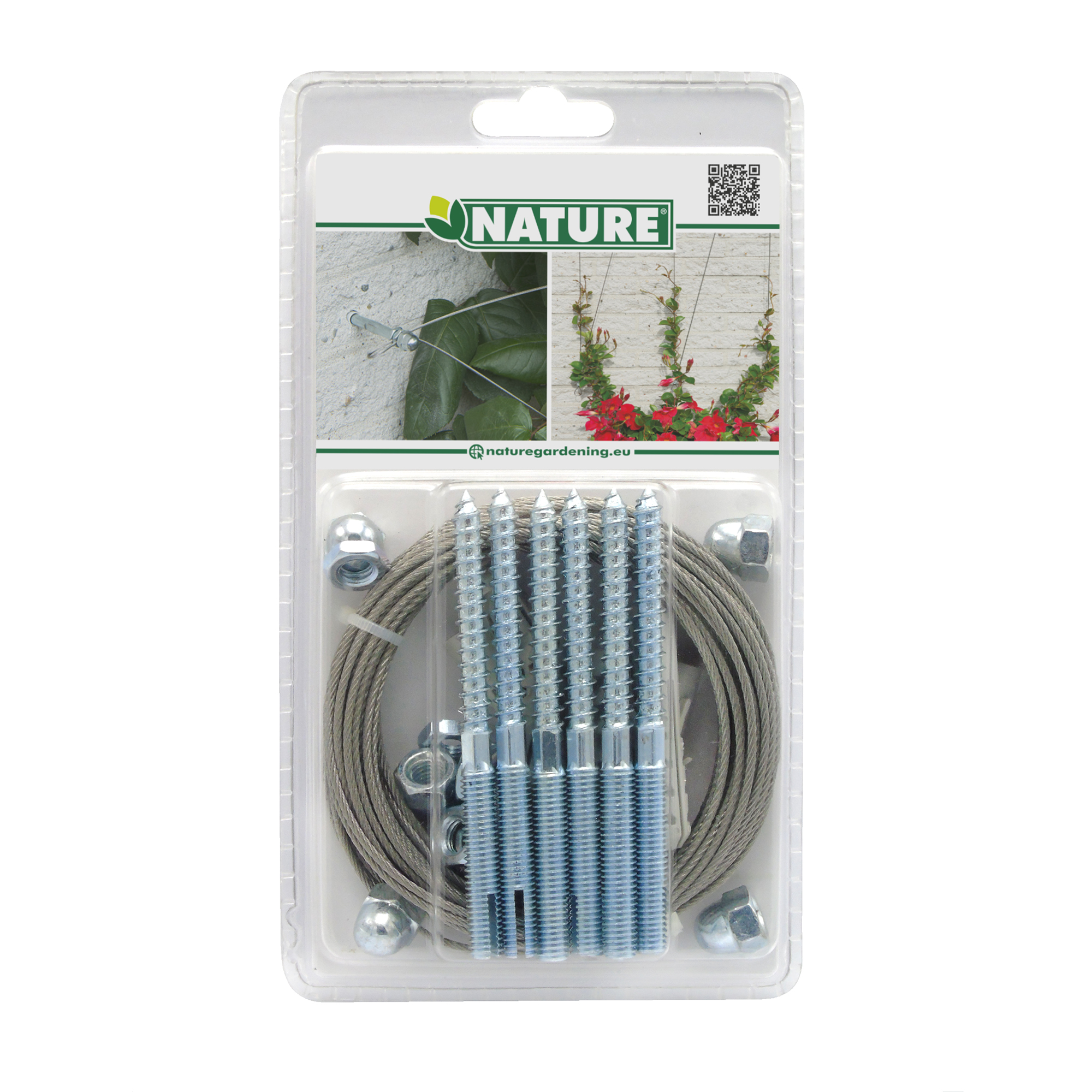 Dit spandraadsysteem van Nature is zeer robuust en geschikt voor alle soorten klimplanten. Het spandraad is nauwelijks zichtbaar en biedt maximale ondersteuning. Deze set bevat een gegalvaniseerd stalen kabel (10 meter) en 6 wandpluggen waarmee u een klimrek kunt maken in elke gewenste vorm of maat.