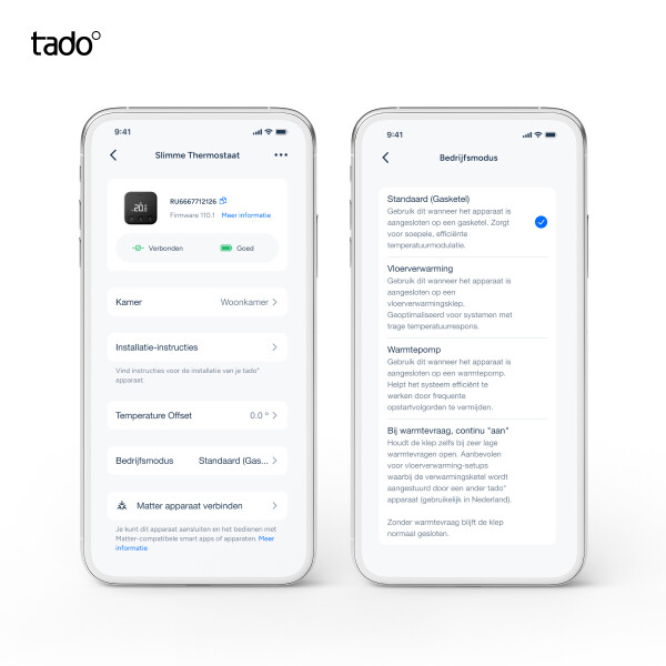 Met de introductie van deze gratis functie kunnen tado°-gebruikers nu de regelmodus selecteren die het beste bij hun verwarmingssysteem past. Dat kan rechtstreeks in de app met speciale instellingen voor: