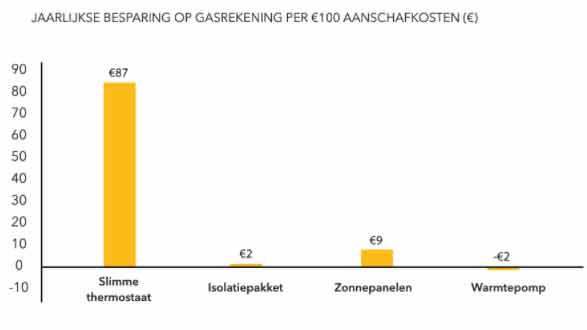 Maatregelen zoals het plaatsen van warmtepompen, zonnepanelen of het aanbrengen van isolatie kunnen 10x meer kosten dan de aanschaf van een slimme thermostaat. De meest kosteneffectieve stap naar bescherming tegen de prijsstijgingen is om te investeren in een slimme thermostaat en het energieverbruik te verminderen. Overweeg je om te investeren en de energierekening van je huis te verlagen? De onderstaande grafiek laat de effectieve besparingen op de gasrekening per geïnvesteerde €100 zien:
