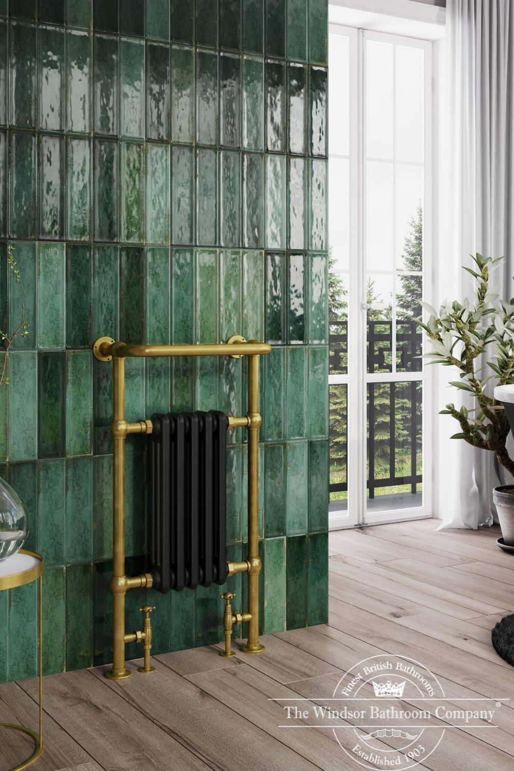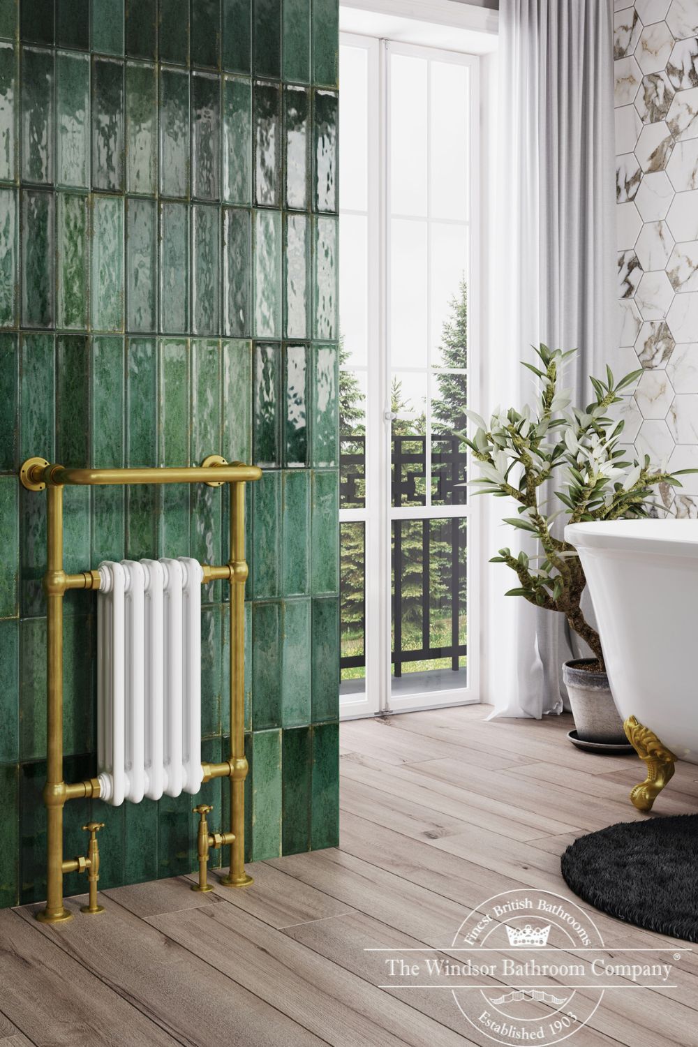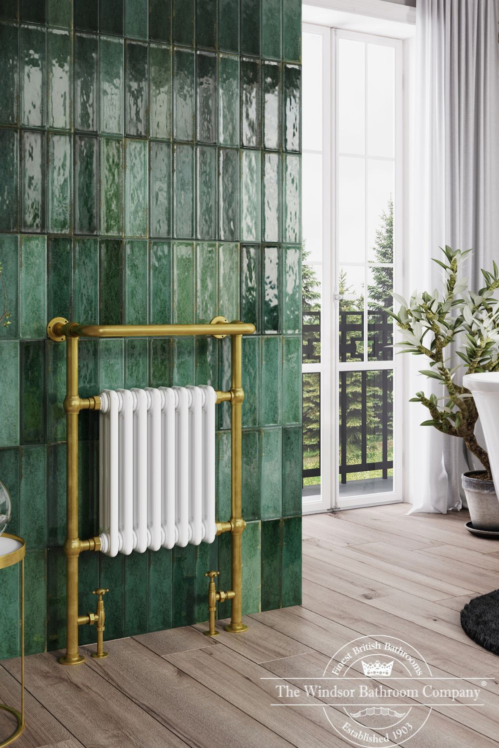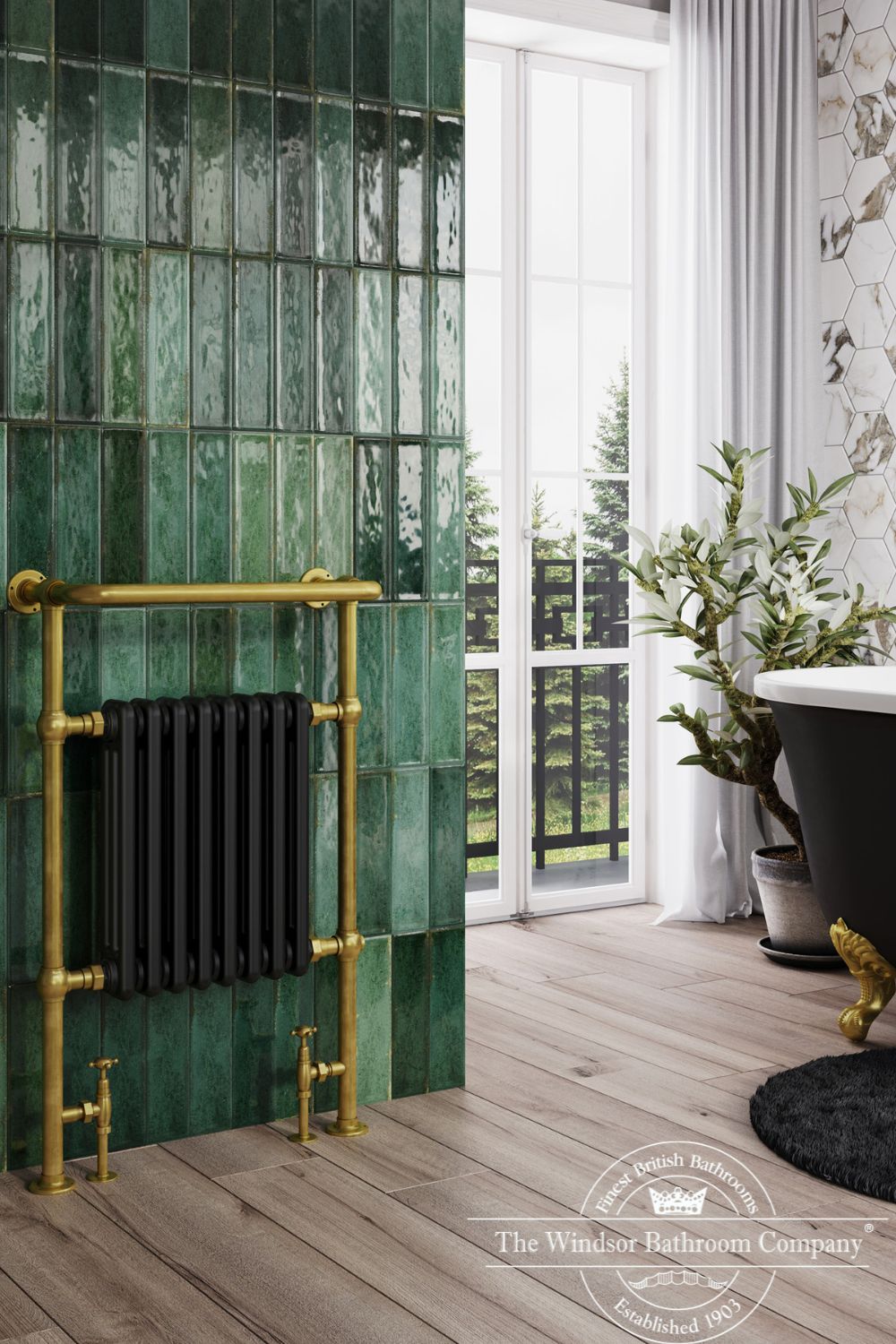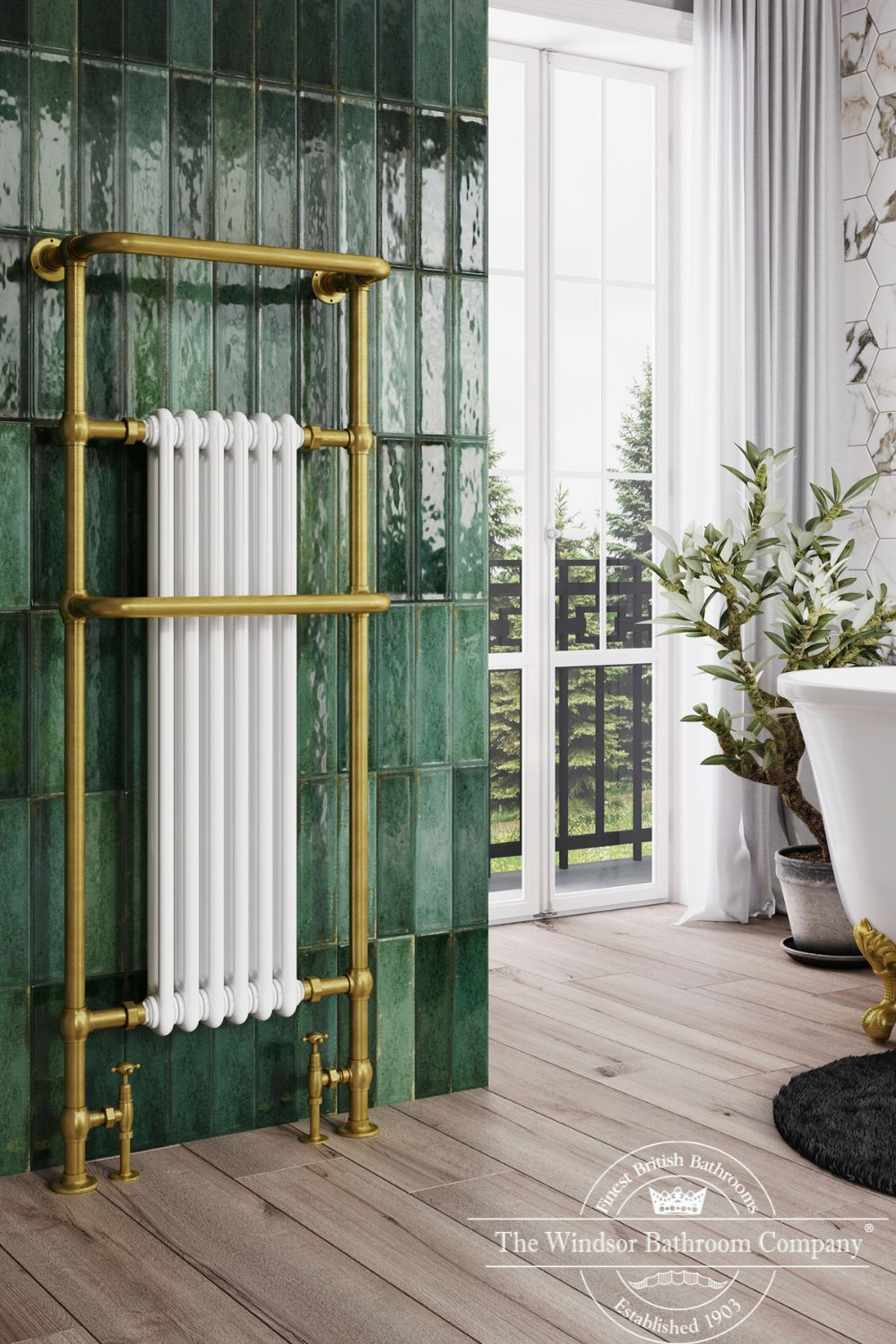 De Baywater handdoekradiator straalt elegantie en klasse uit. Leverbaar met mat zwarte of witte elementen in combinatie met geborsteld goud.