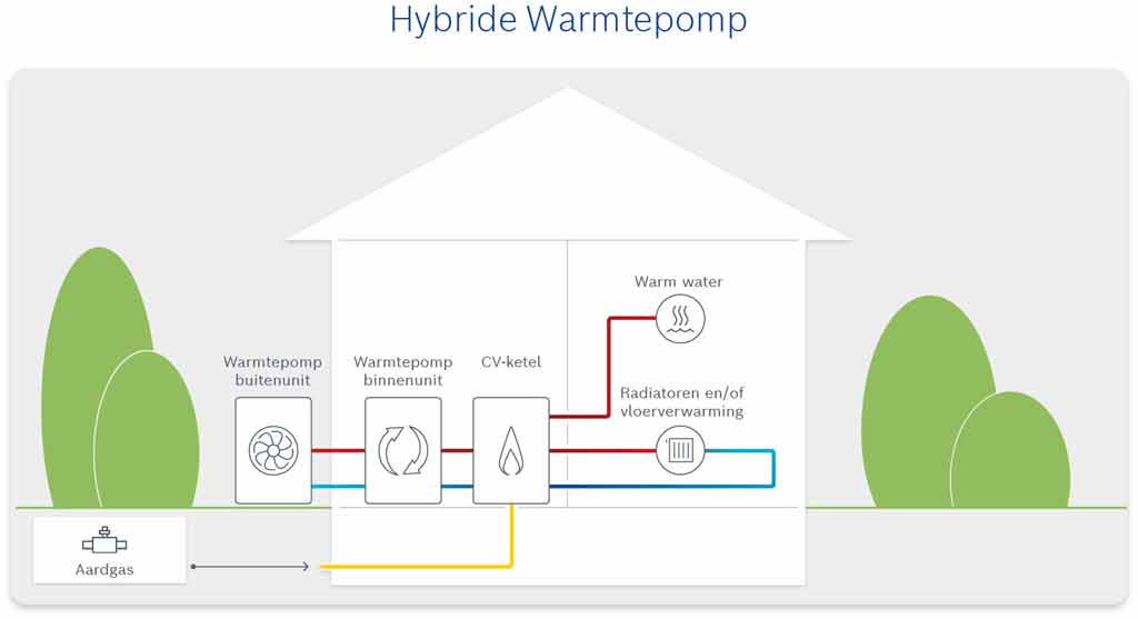 Voldoet je huidige cv-ketel nog en wil (of kun) je nog niet van het gas af? Dan is het laten aansluiten van een luchtwarmtepomp op je cv-ketel een goede optie. In dat geval kiest je systeem dan steeds de meest efficiënte warmtebron. De warmtepomp doet het meeste werk en de cv-ketel springt alleen bij als het erg koud is. Zo bespaar je al snel tot 70% gas. Een prettig vooruitzicht, zeker als je bedenkt dat de gasprijs flink gaat stijgen in nabije toekomst. Met deze oplossing combineer je het beste van twee werelden en bovendien kun je in de toekomst nog alle kanten op. Daarnaast hoef je aan je woning niets te veranderen. Zelfs je huidige radiatoren of vloerverwarming kun je blijven gebruiken. En qua aanschaf is een hybride warmtepomp ook zeker een haalbare kaart. Naast de extra subsidie, profiteer je bij Nefit Bosch tijdelijk van de cashback. En dat geldt ook als je een warmtepomp huurt.