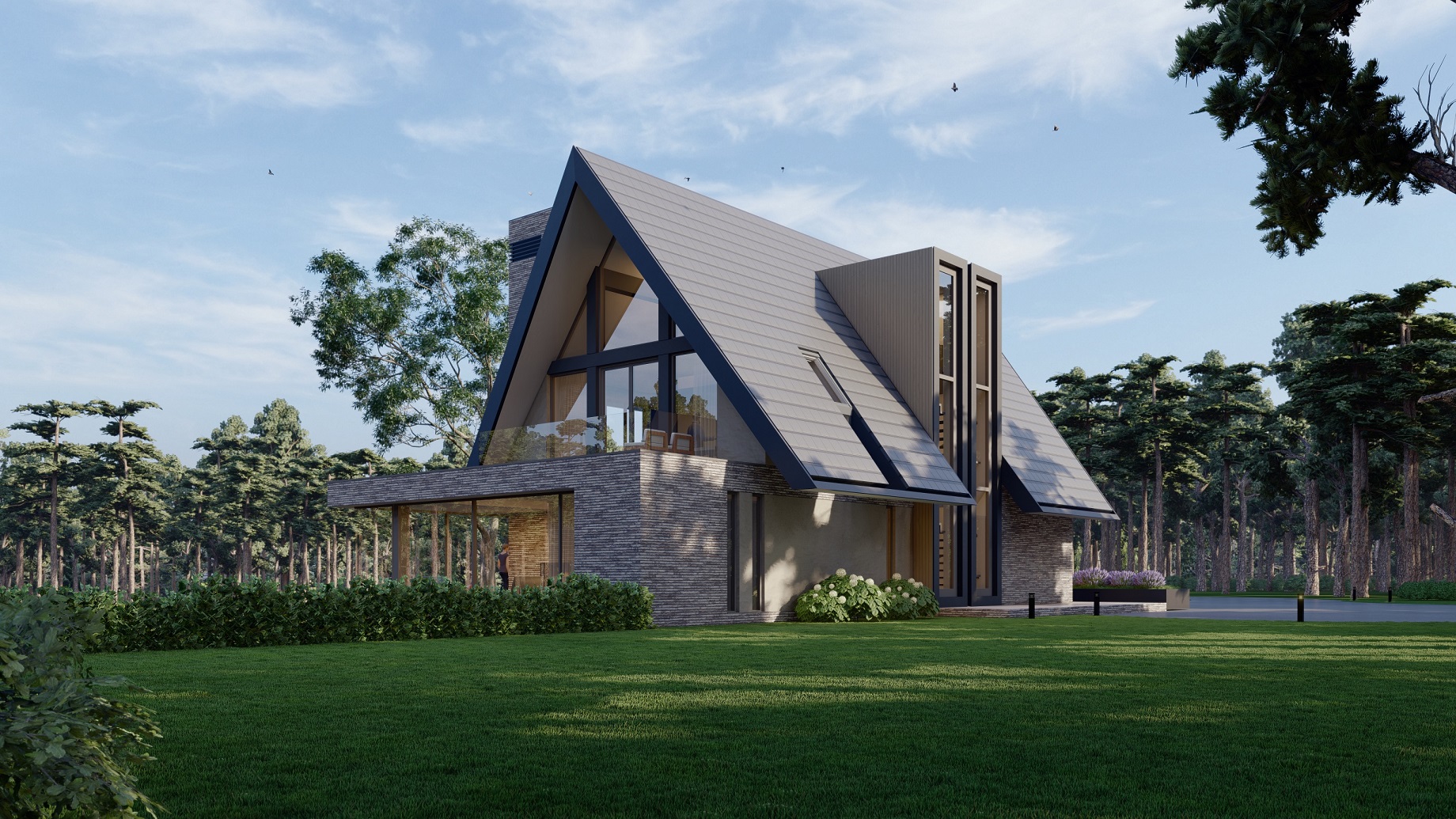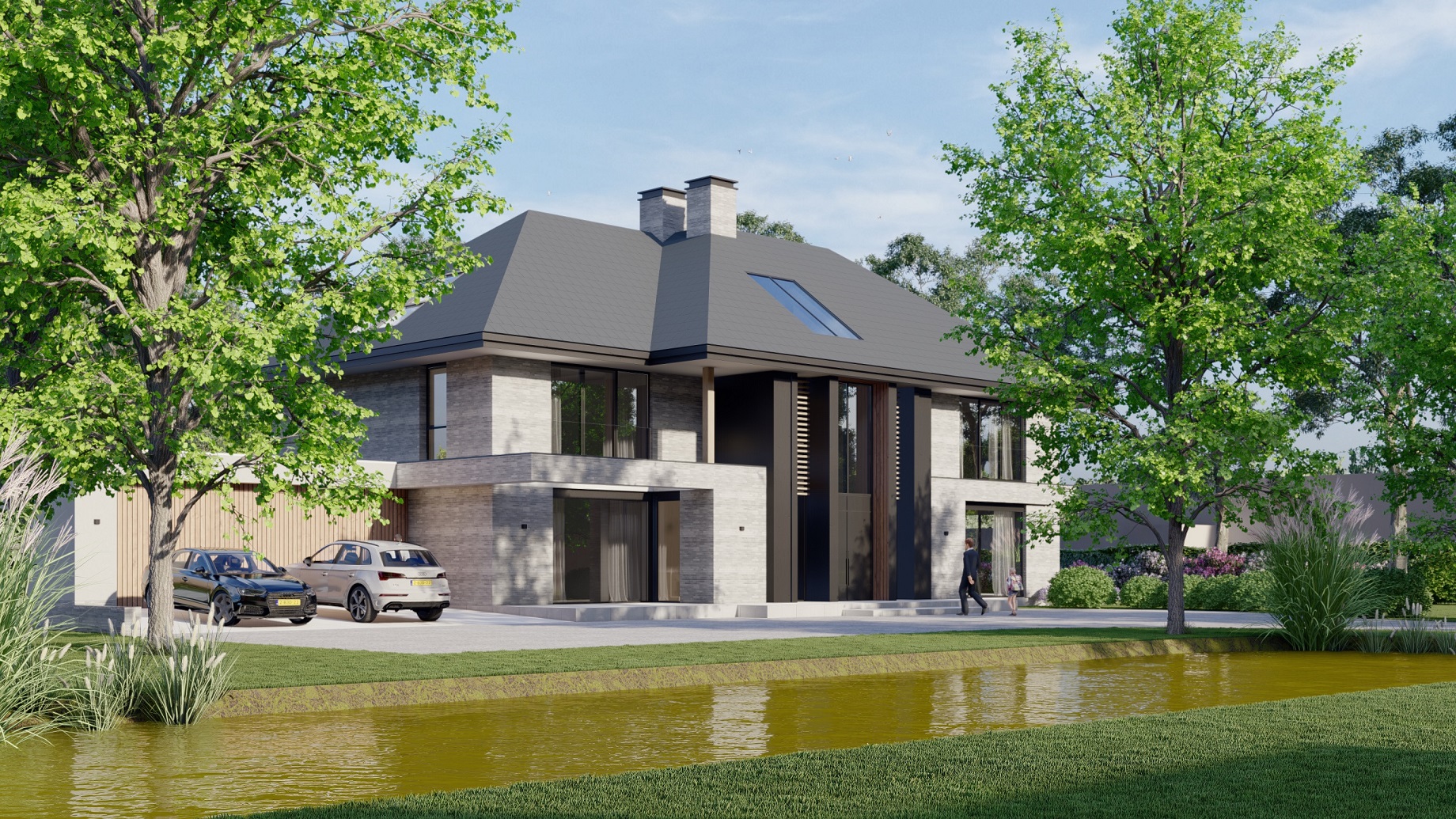 Een modern ontworpen villa met een dieprode baksteen, vlakke dakpannen, en strakke hardhouten raamkozijnen.