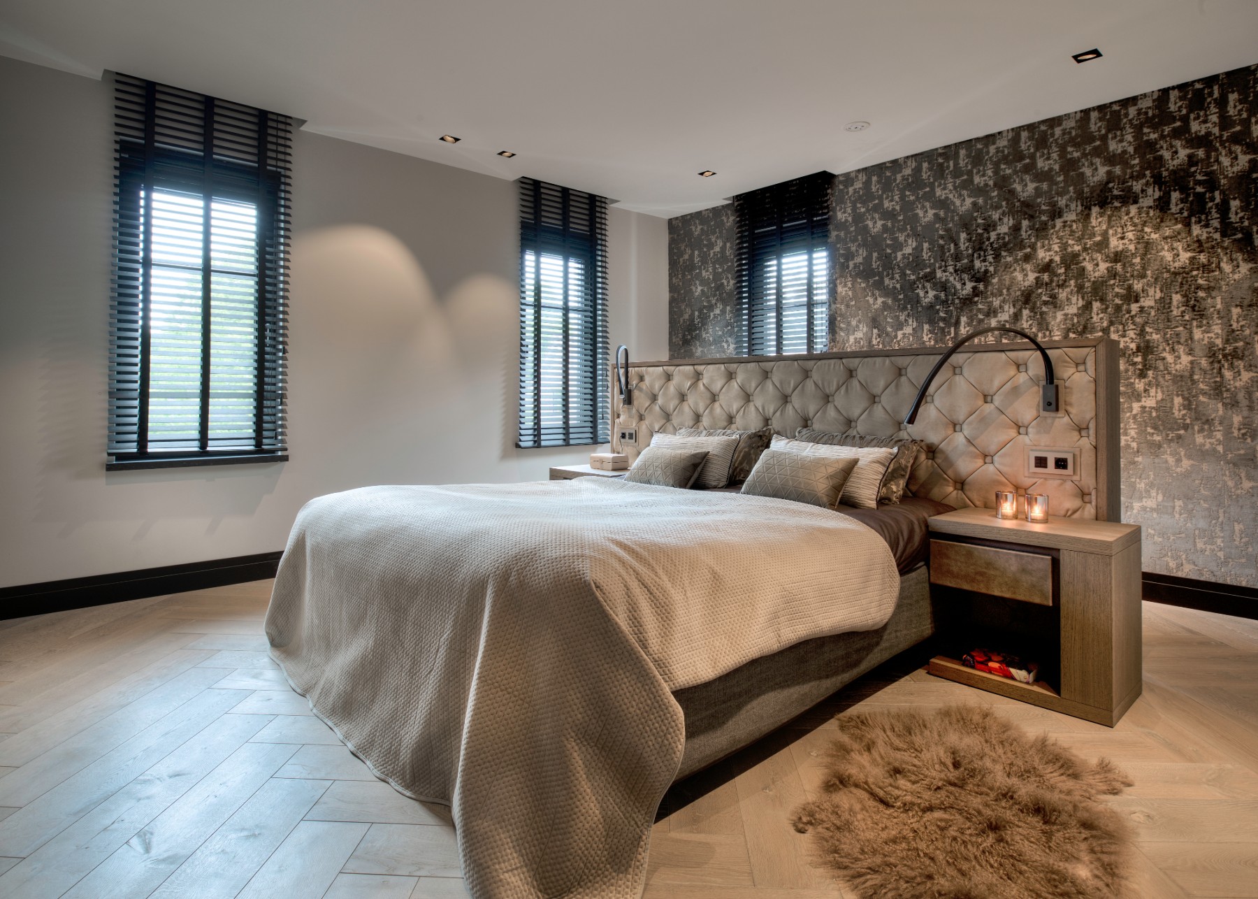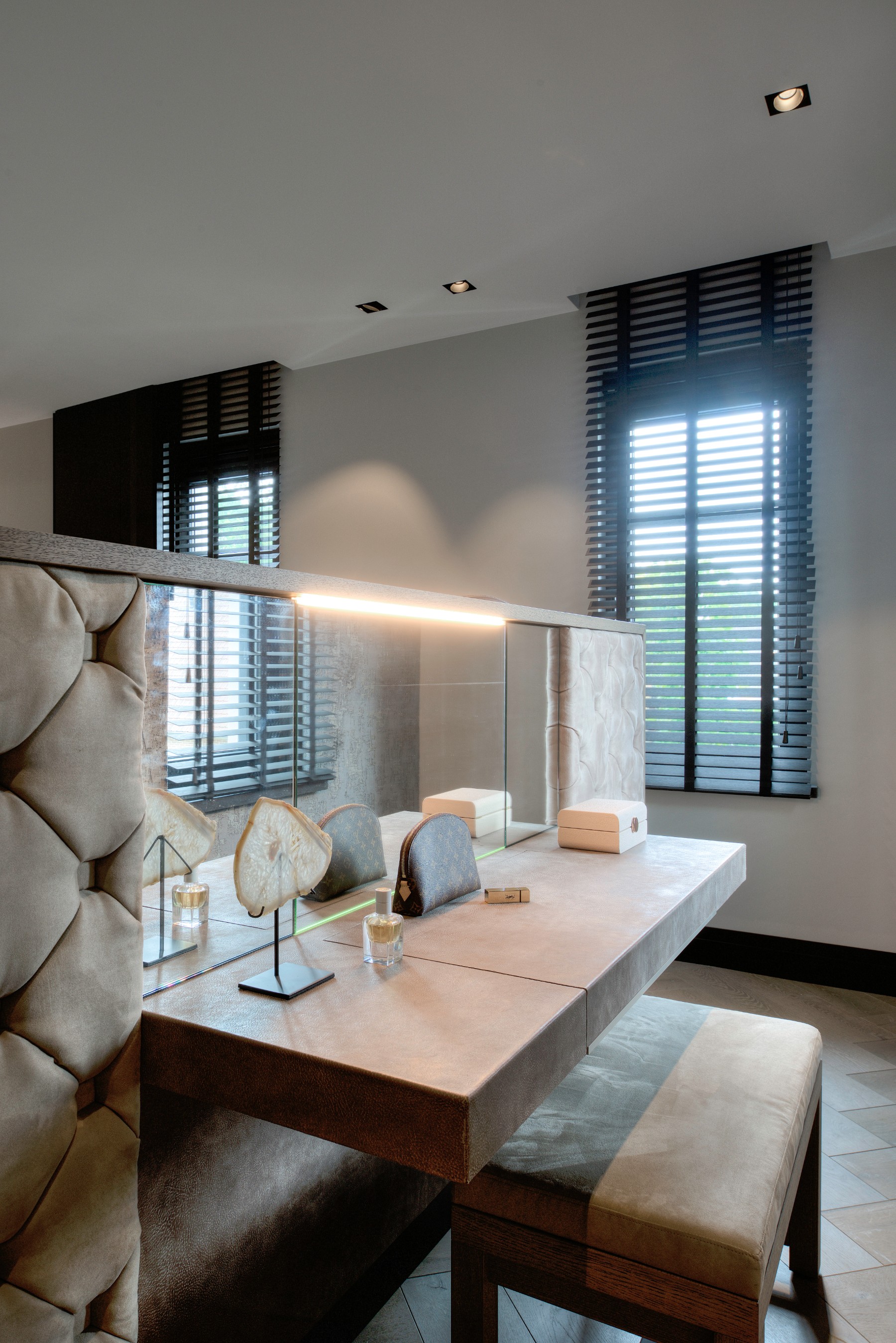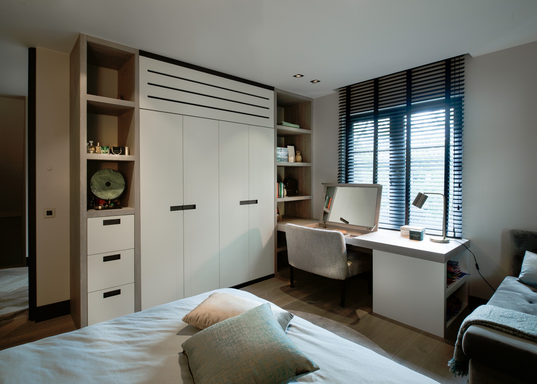 Een praktische oplossing kan ook zeker mooi zijn! Bij het ontwerp van deze villa is hier zeker rekening mee gehouden door Eric Kant! Denk aan de mooi verwerkte kaptafels aan de achterzijde van het bed in de master bedroom. Of de kaptafel verwerkt in het bureau bij de andere slaapkamer. Ook een airco kan soms lelijk in de weghangen, maar op deze manier is deze heel netjes weggewerkt waardoor je niet doorhebt dat er airco in de slaapkamer is!
