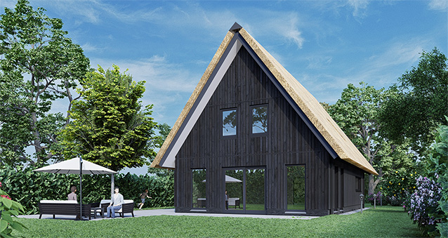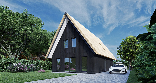 Deze uitvoering van de schuurwoning straalt authenticiteit uit. Het gebruik van hout als gevelbekleding geeft de woning een warme en uitnodigende uitstraling. In combinatie met een rieten dak ontstaat een bijzonder geheel dat zowel traditioneel als tijdloos oogt. De rechte lijnen van de architectuur zorgen daarbij voor een krachtige basis, terwijl de materialen juist verzachten en verrijken.