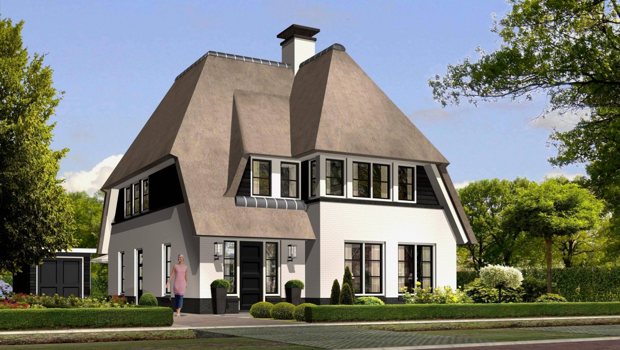 Een royale rietgedekte villa met asymmetrische kap te Aerdenhout, wit gekeimd, modern uitgevoerd