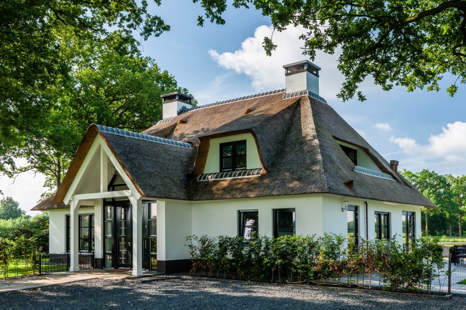 Een rietgedekt landhuis met een wel heel bijzondere kap! De combinatie van witte gevels en houten potdekselwerk geven het landhuis een stoere uitstraling.