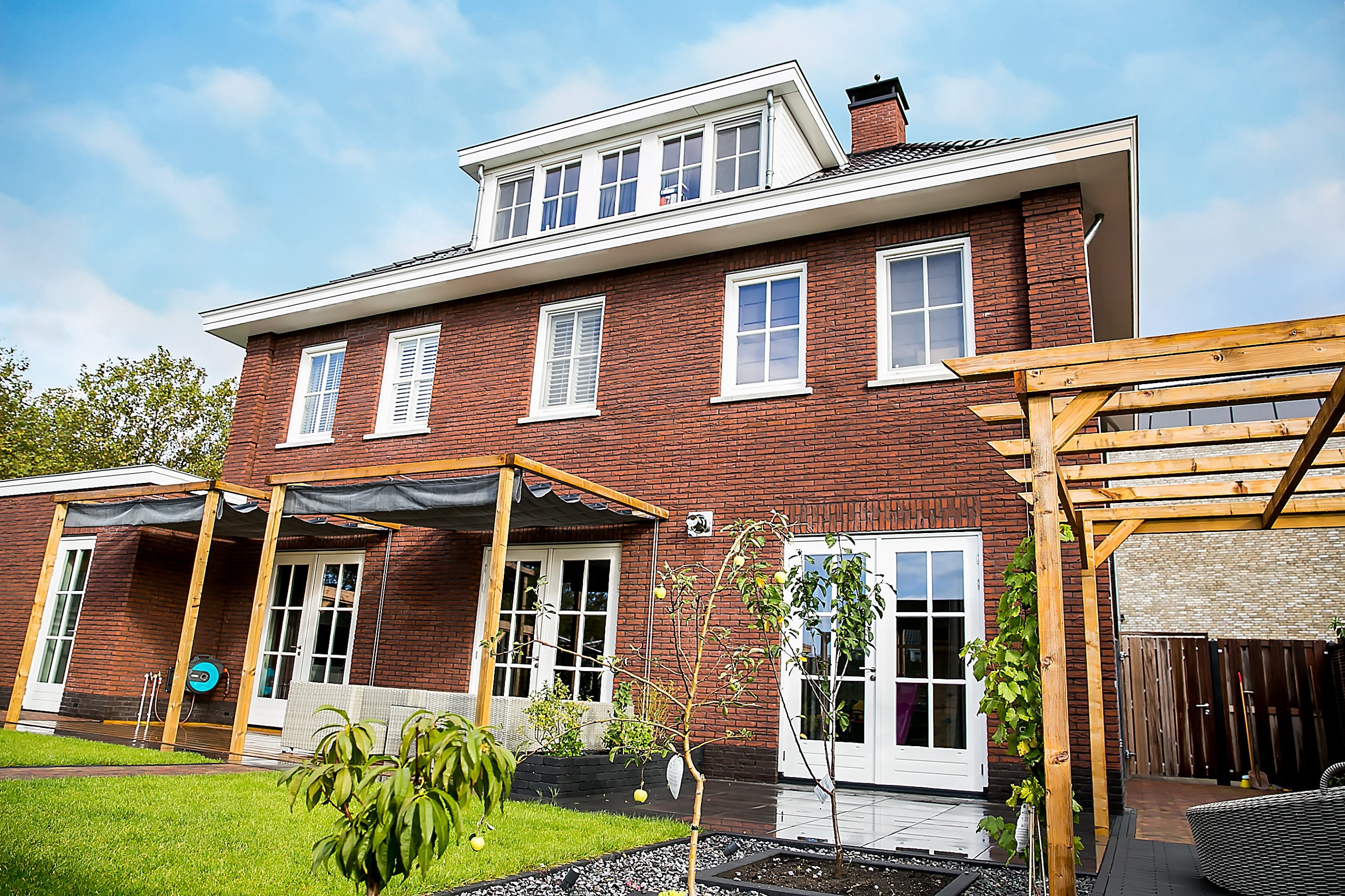 De kracht van villa Nachtpauwoog is het riante bouwvolume. Doordat het een hoge woning is, of ook wel een herenhuis, is er op de verdieping bijna net zo veel ruimte als op de begane grond. Deze opdrachtgevers hebben gekozen voor donkerrood metselwerk en een prachtige marmeren lijst bij de voordeur. Hierdoor is een unieke, naar wens ontworpen villa gebouwd!