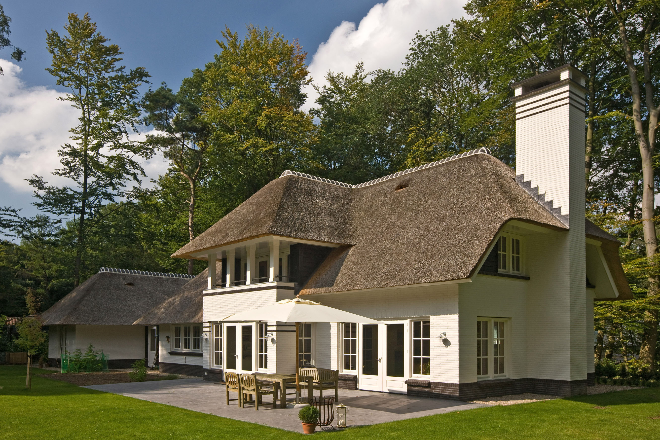 Dit landhuis is door ons geheel naar wens van de opdrachtgever ontworpen, uitgewerkt en uiteindelijk gerealiseerd. De stijlkenmerken van dit landhuis komen uit de jaren '20 en '30; Drie donkere rollagen bij de pilaren, een robuust balkon aan de achterzijde en een grote schoorsteen.