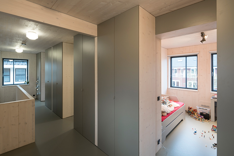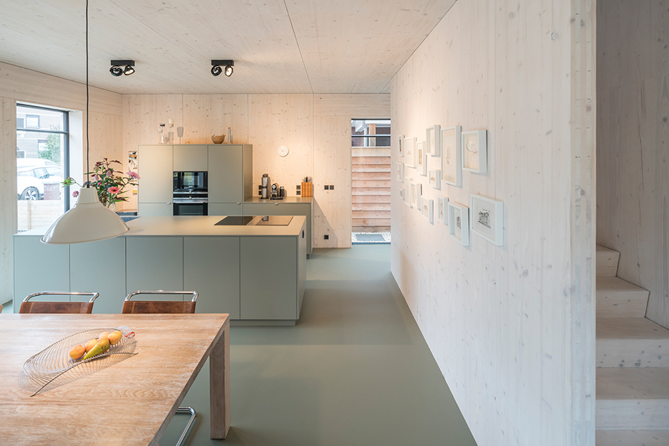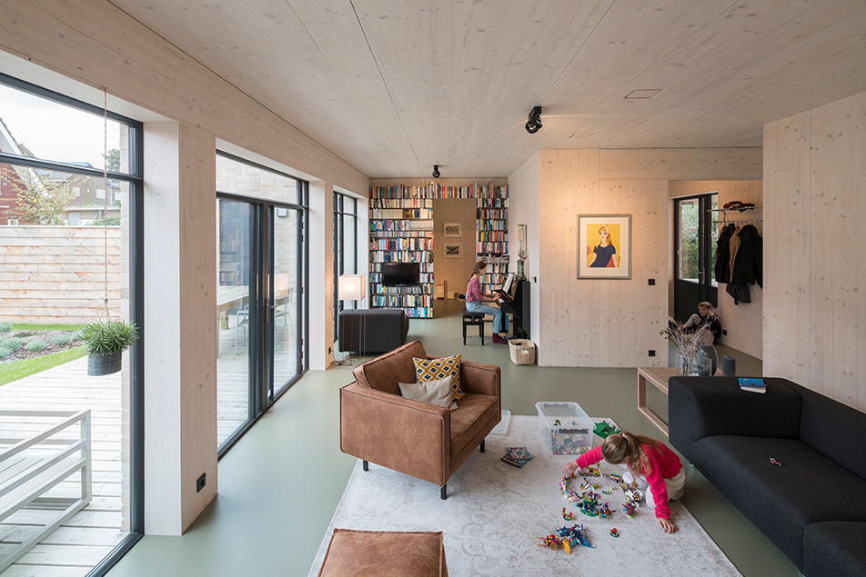 Ook de beslissing om geen deuren op de begane grond te plaatsen en de introductie van grote openingen zorgen ervoor dat de ruimtes helder aanvoelen en verbonden zijn met de buitenlucht. De grote ramen geven voorts veel gratis licht en verwarmen ook passief. De extra energie die nodig is voor verwarming en warm water komt van een warmtepomp die werkt in combinatie met zonnepanelen.